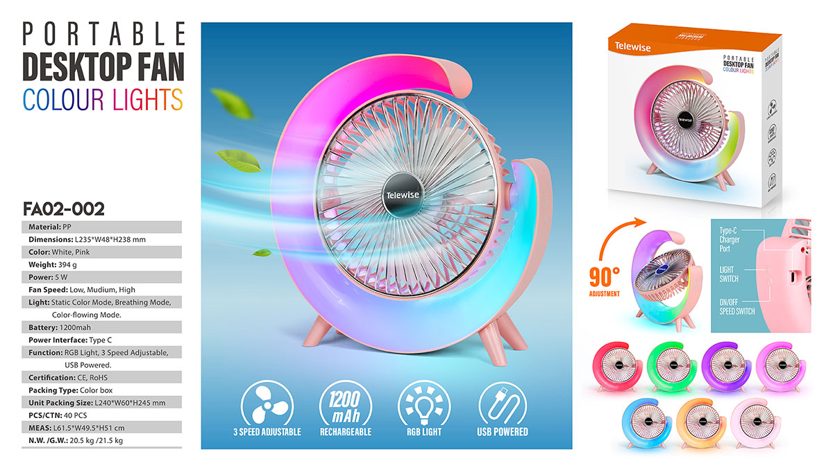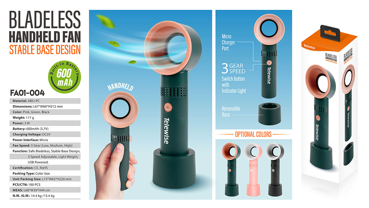 USB powered wireless mini portable desktop fan with three fan speed level – low, medium, and high.