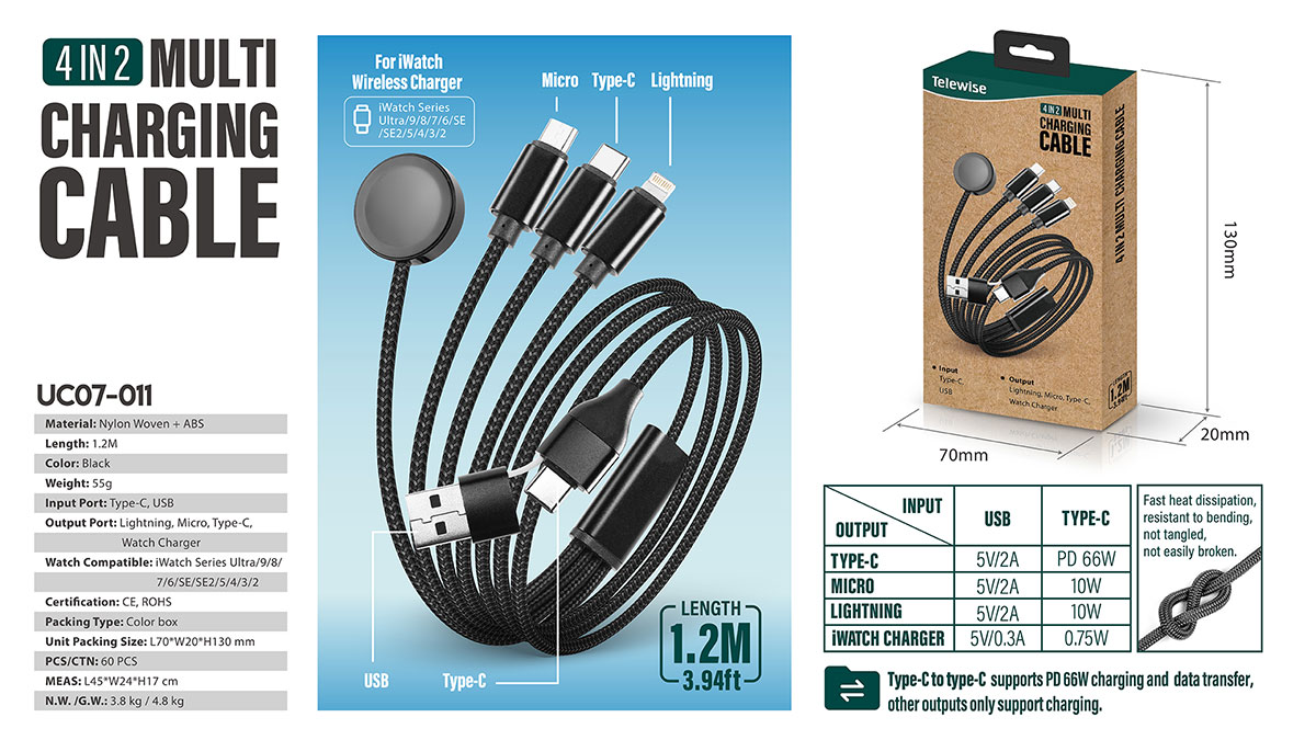 66W Full Charging, Saving More TimeWide Compatibility: Magnetic apple watch fast charging port compatible with all Apple Watch Series Ultra/9/8/SE2/7/6/SE/5/4/3/2/1; Lightning port compatible with iPhone 14/13/12/11/11 Pro/11 Pro Max/XS;The Type-C port supports iPad, iPhone15 series, Macbook Pro, Laptops, Galaxy and other Type-C Smartphones. The Micro USB port is compatible with Samsung Galaxy S7/S6/S4 and most Android Phones as well as Kindle, Bluetooth headsets, PS4 controllers and more.A perfect quick Charging Cable for Multiple Devices.Fast heat dissipation, resistant to bending, not tangled, and not easily broken.