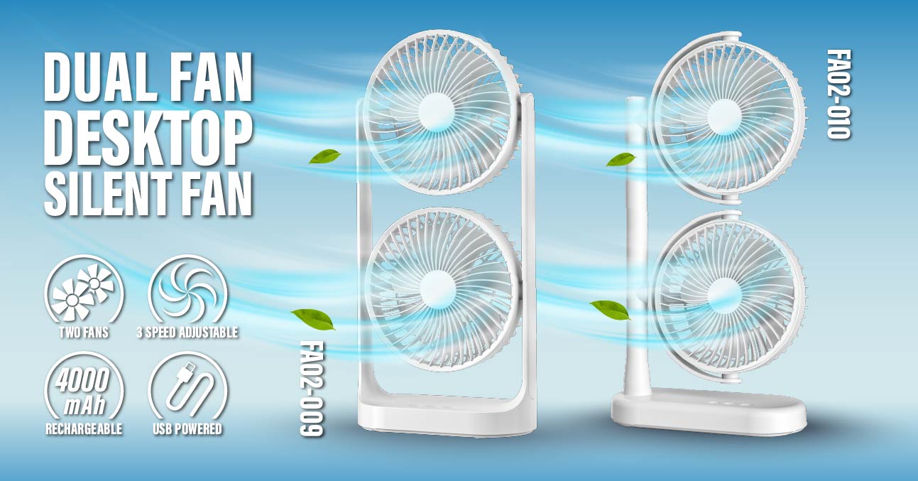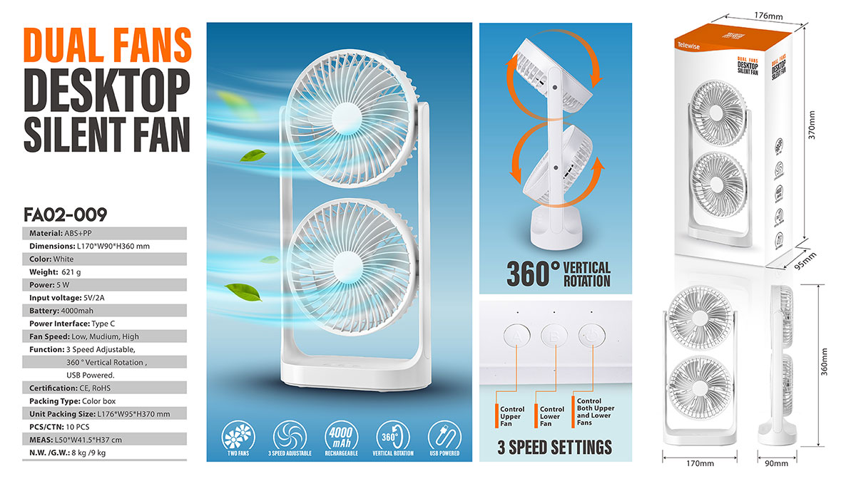 This double head fan is compact enough to fit on any desk or table without taking up too much space. The fan features separate A and B buttons to control the upper and lower fans respectively. Each button allows you to cycle through three different speed settings or turn off the fan with a short push. With its silent fan motor, this desk fan operates quietly.
