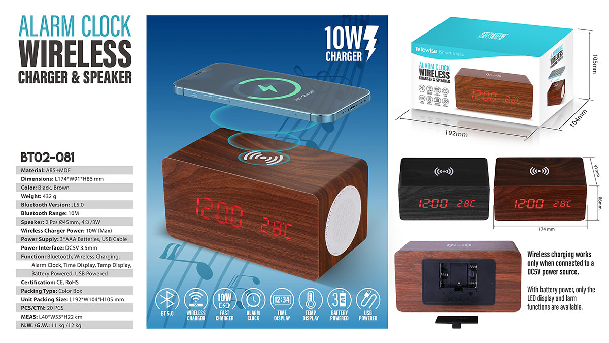 Wooden Wireless Speaker, Wireless Charger, Alarm Clock, Temp Display are integrated into one design.