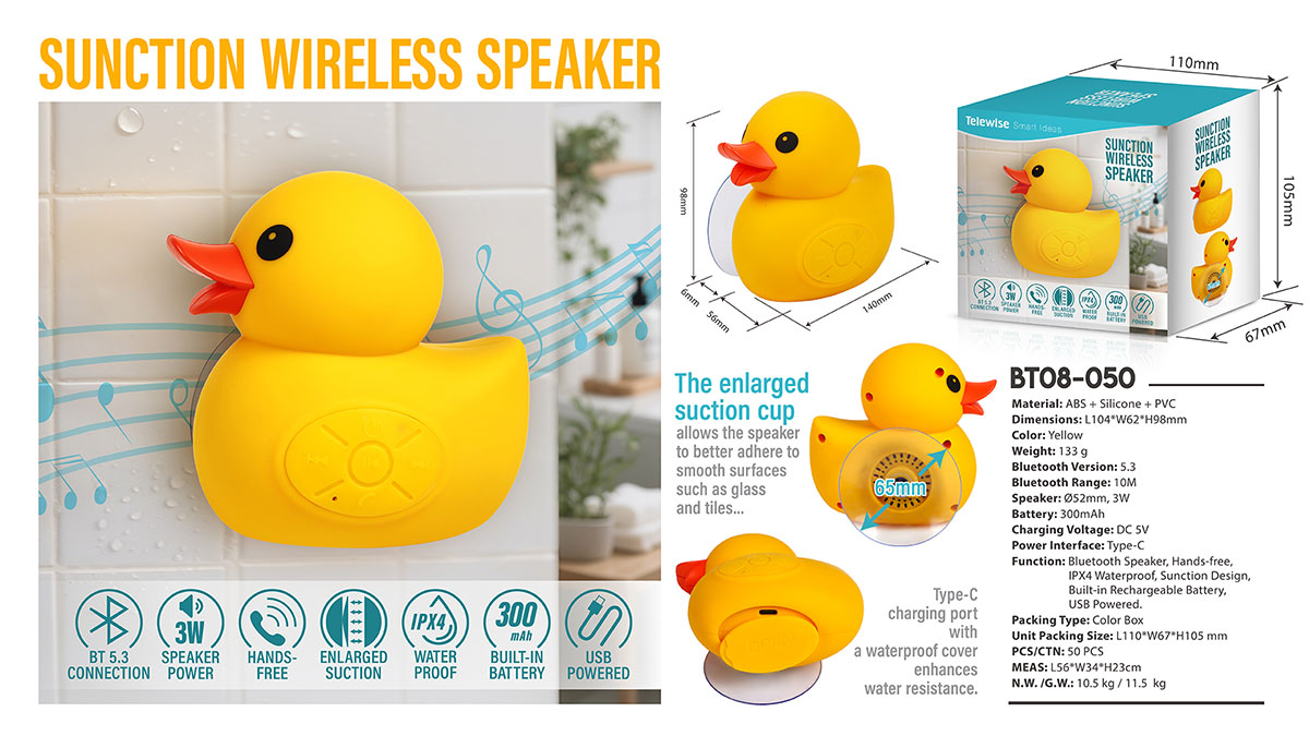 Adorable in a cute little yellow duck design, it’s your perfect bath-time companion! —its waterproof build keeps the music going, even with splashes, features a built-in mic for hands-free calls, Strong suction cup hold, IPX4 water resistant.