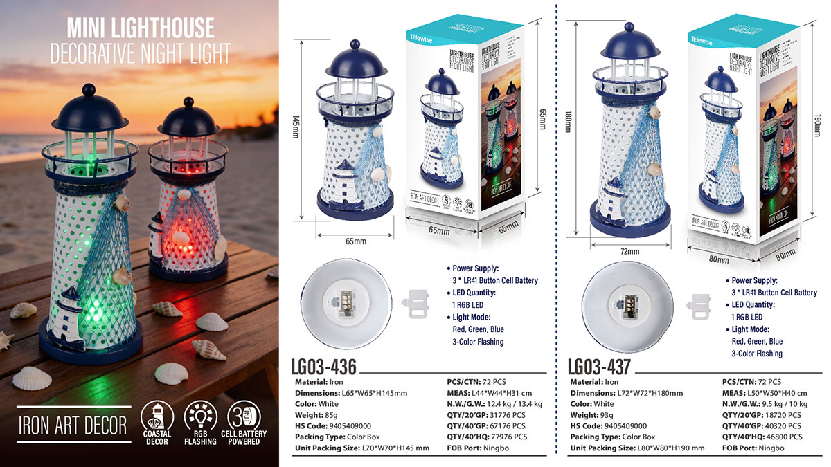 Mini Lighthouse Decorative Night Light!Bring the magic of the coastline to your space! This eye-catching iron art lighthouse, adorned with authentic fishing net and natural shells, glows with vibrant red, blue and green flashing lights. Perfect for adding a whimsical nautical vibe to your home, patio or party.