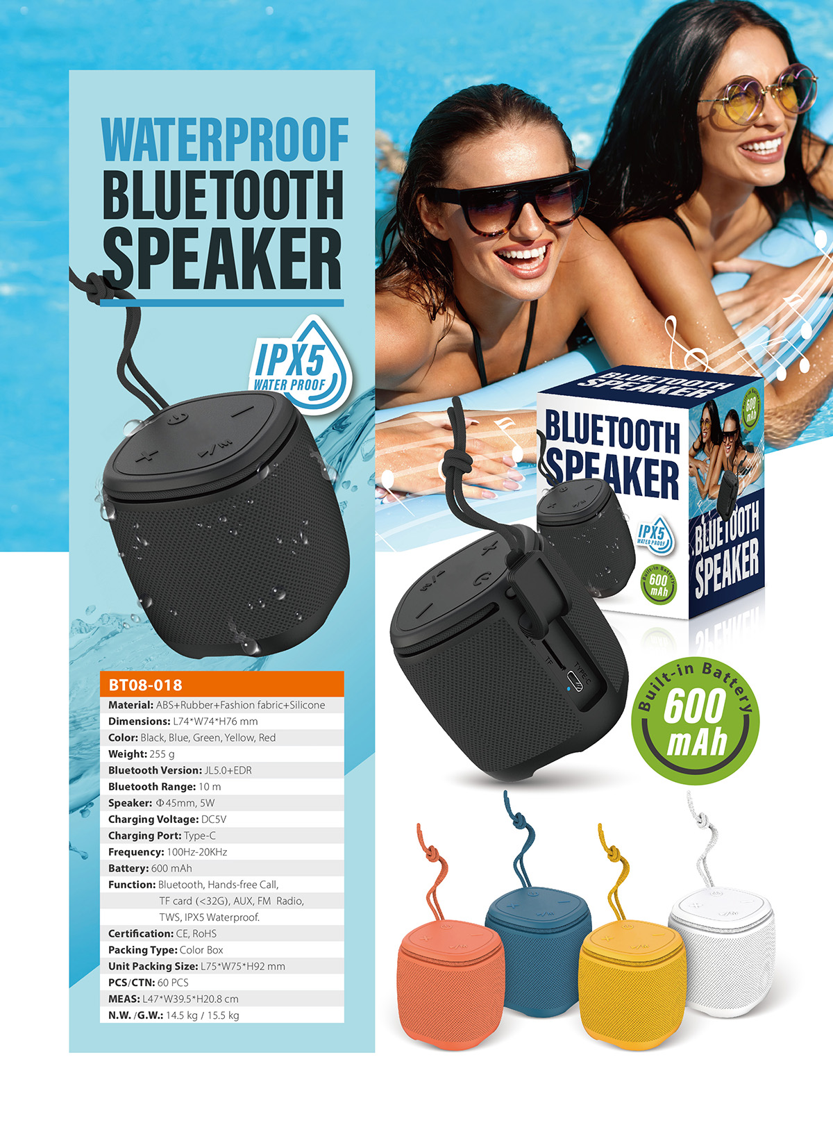 - Function : Bluetooth, Hands-free Call, TF card (<32G), AUX, FM Radio, TWS, IPX5 Waterproof.
