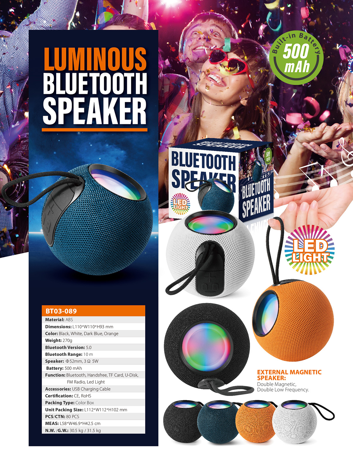 BT03-089The perfect sound quality makes the Bluetooth speaker ideal for outdoors and indoors to enjoy your music. The portable and compact design also makes the speaker used as a unique led night light, which creates a romantic atmosphere to light up your space.