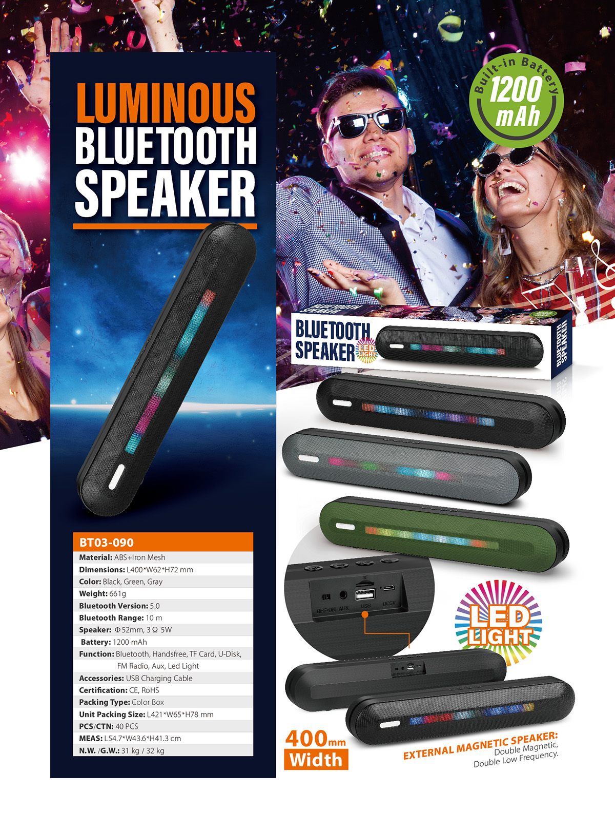 - Function : Bluetooth, Handsfree, TF Card, U-Disk, FM Radio, Aux, Led Light