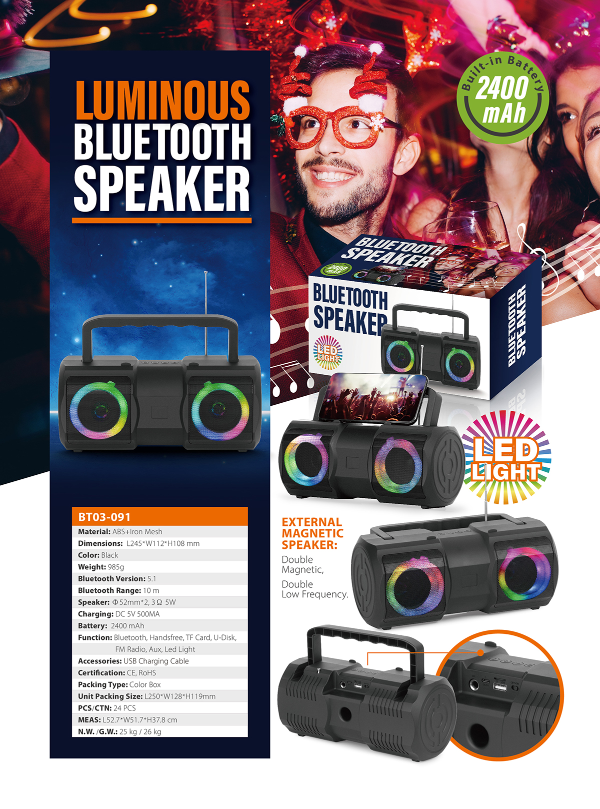 BT03-091The perfect sound quality makes the Bluetooth speaker ideal for outdoors and indoors to enjoy your music. The portable and compact design also makes the speaker used as a unique led night light, which creates a romantic atmosphere to light up your space.