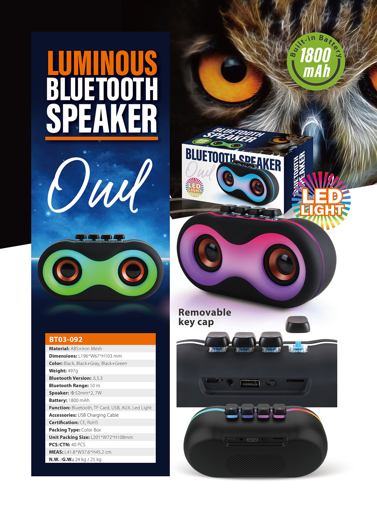BT03-092The perfect sound quality makes the Bluetooth speaker ideal for outdoors and indoors to enjoy your music. The portable and compact design also makes the speaker used as a unique led night light, which creates a romantic atmosphere to light up your space.