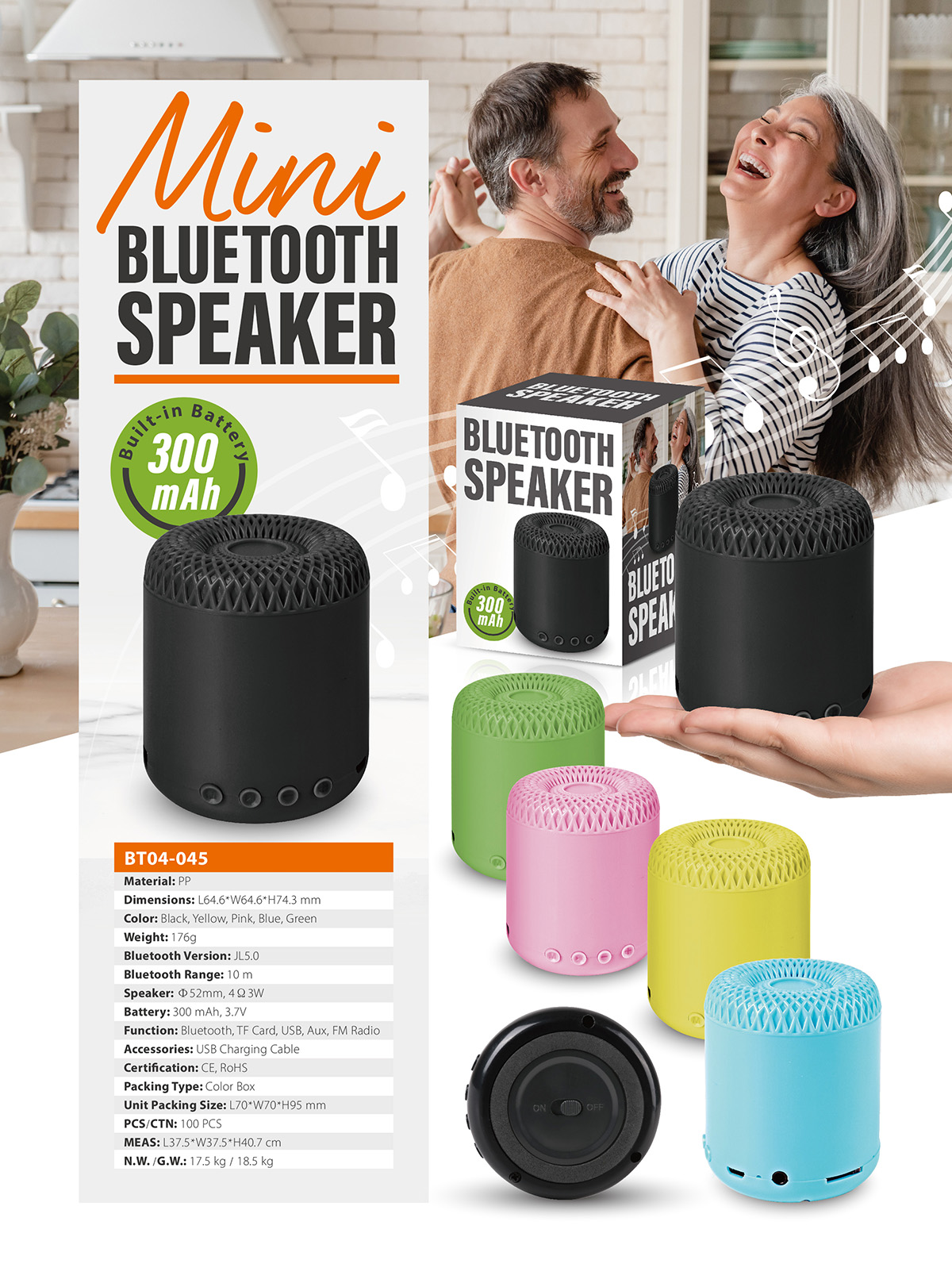 BT04-045The Bluetooth speaker supports Bluetooth Connection, 3.5mm aux cable and high capacity TF card.You can enjoy music for multiple connection ways. You can enjoy music with this small wireless Bluetooth speaker outdoor and indoor.