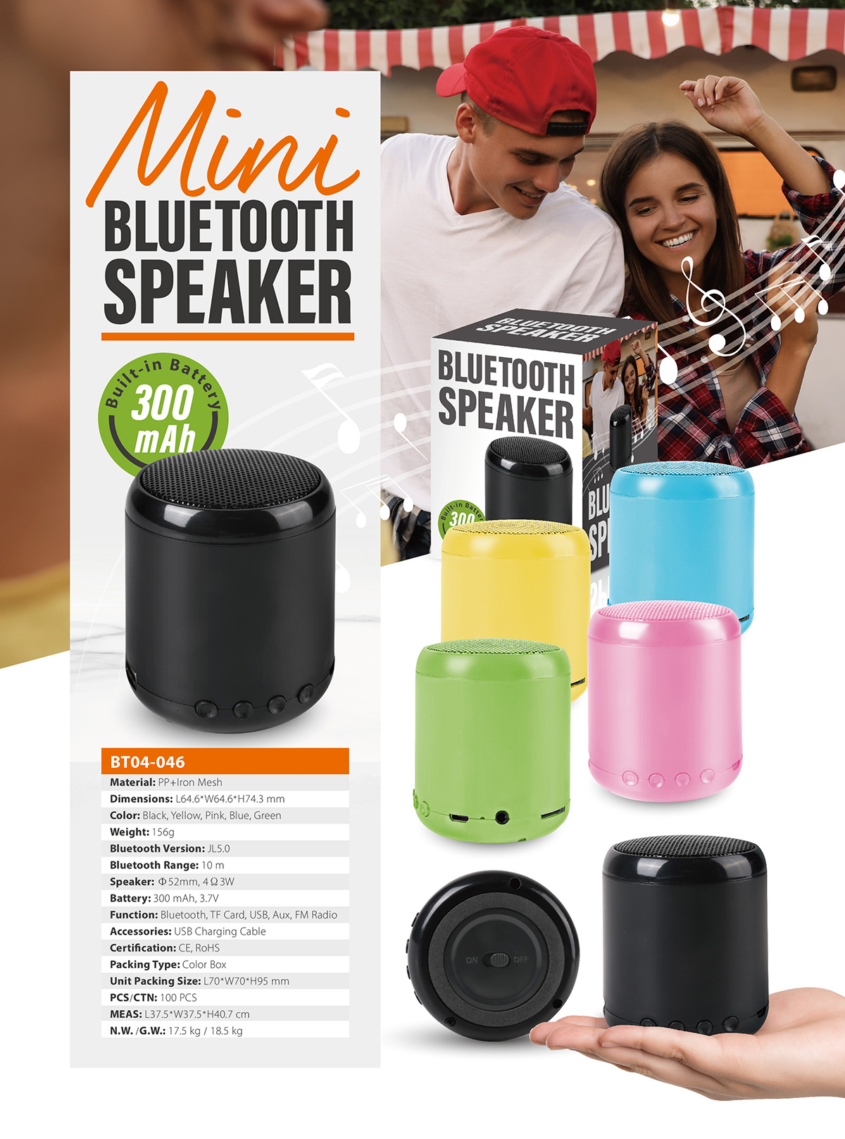 BT04-046The Bluetooth speaker supports Bluetooth Connection, 3.5mm aux cable and high capacity TF card.You can enjoy music for multiple connection ways. You can enjoy music with this small wireless Bluetooth speaker outdoor and indoor.