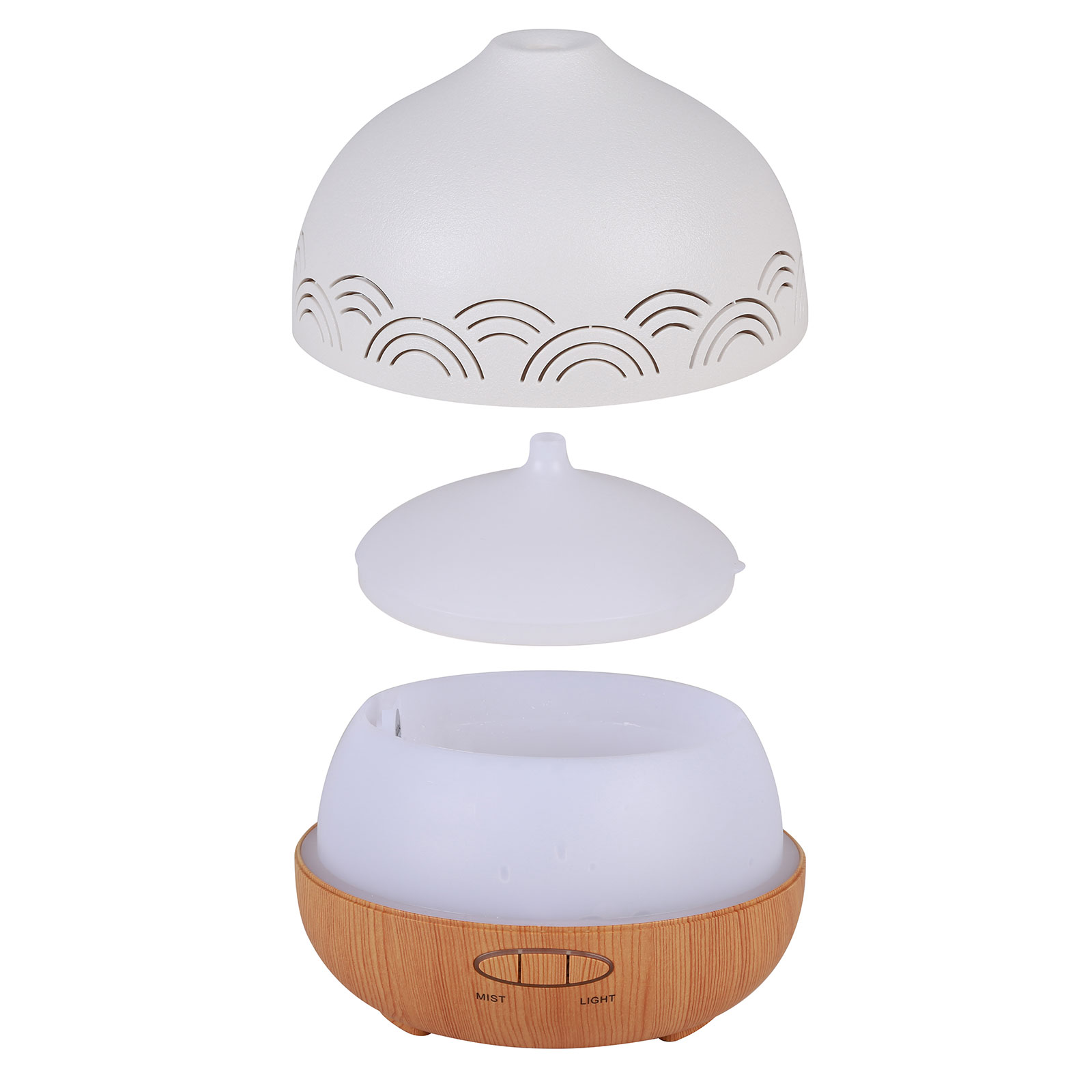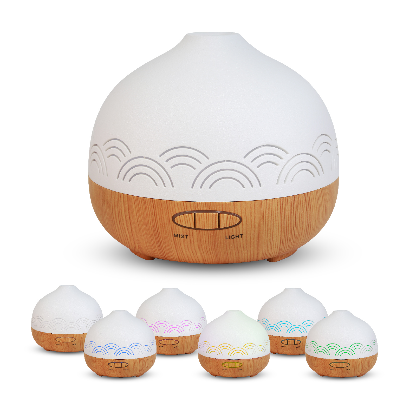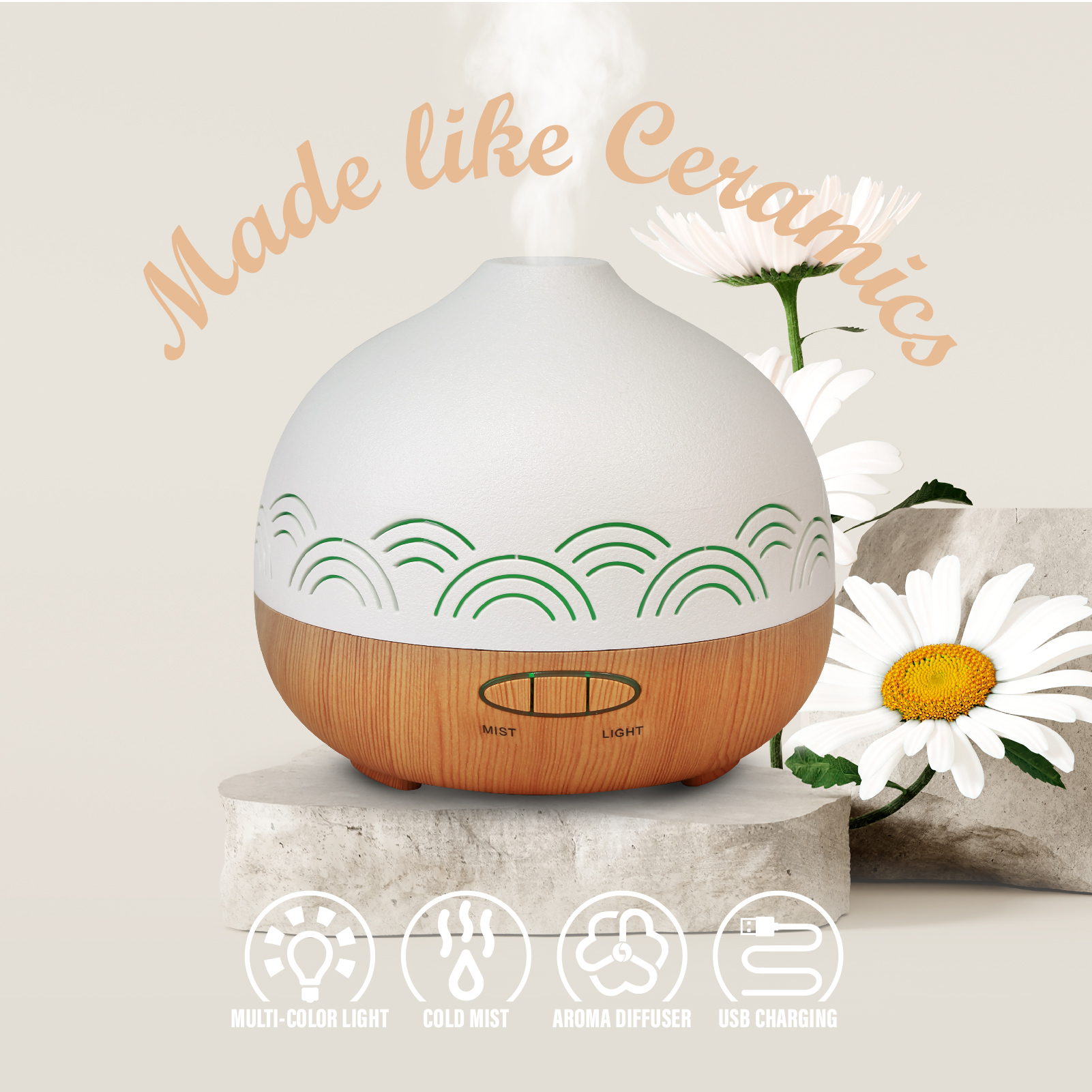 EAH-069This aroma diffuser with an imitation Ceramics Lid Cover and an imitation wood grain base, with 6 colors ambient night light, bringing a romantic healing atmosphere at night, the atmosphere of the room will be very romantic and healing.