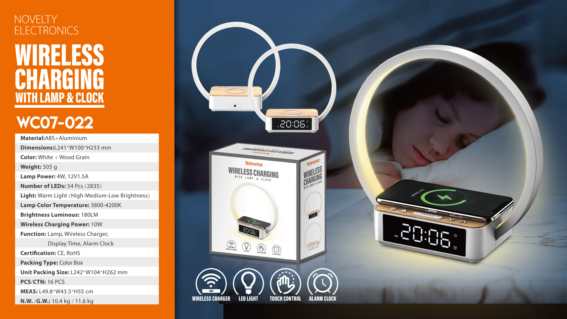 - Function : Lamp, Wireless Charger, Display Time, Alarm Clock