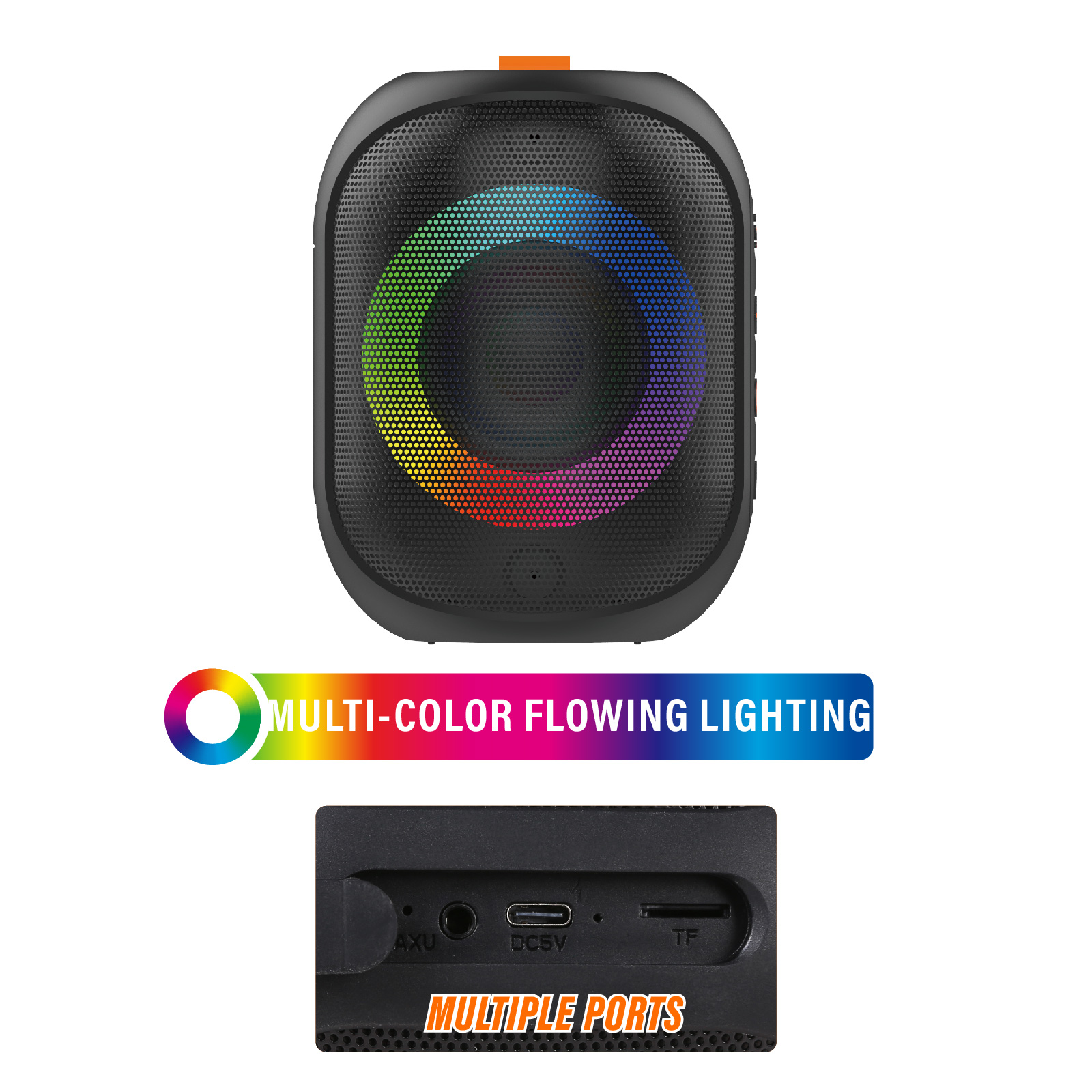 BT03-103Its Low frequency boost design, take your music with you wherever you go with our portable Bluetooth speaker. The Exclusive patent colorful lighting effects, groove to the music beats and occupy your field of vision to light up a hot party. Engineered to handle rough use and adverse weather conditions, this speaker features a durable design and an IPX7 rating for protection against water splashes and spills. It's an ideal choice for outdoor events, and is perfect for use at parties, at the pool, on the beach, while camping or hiking, and more.
