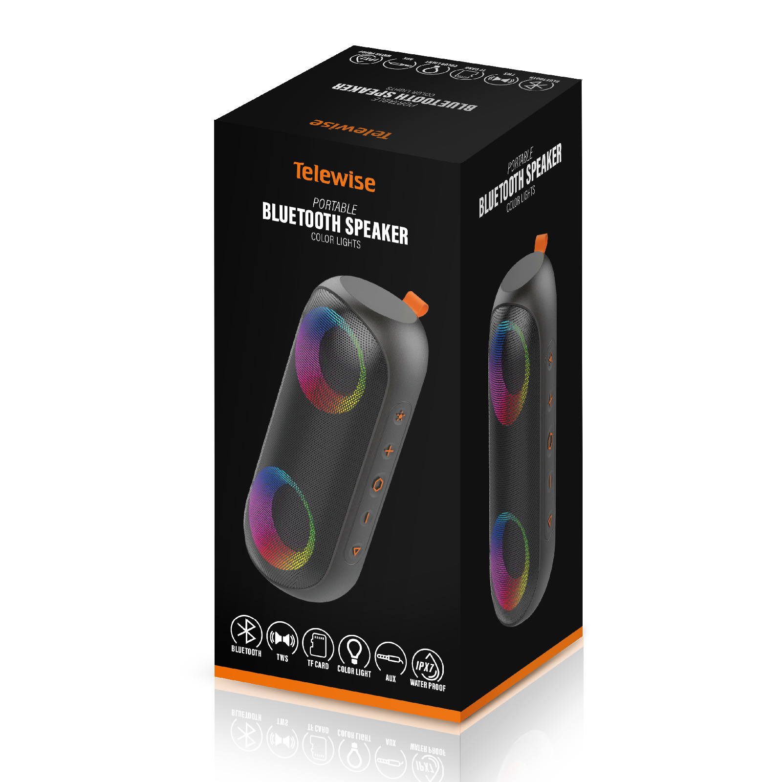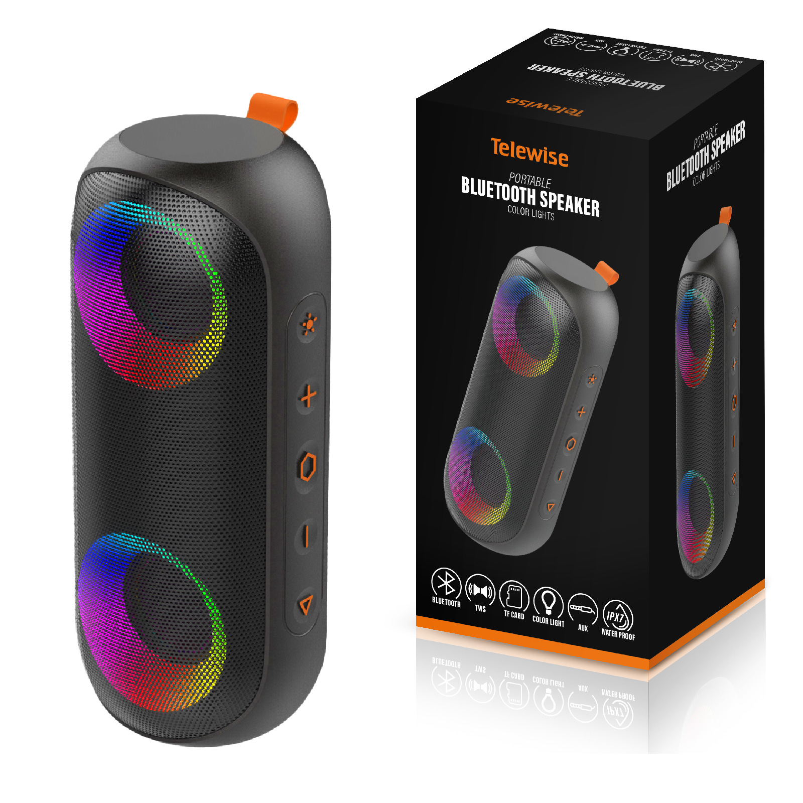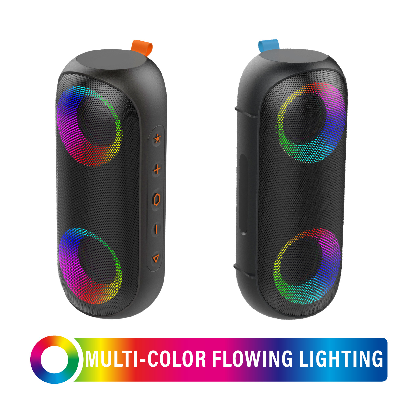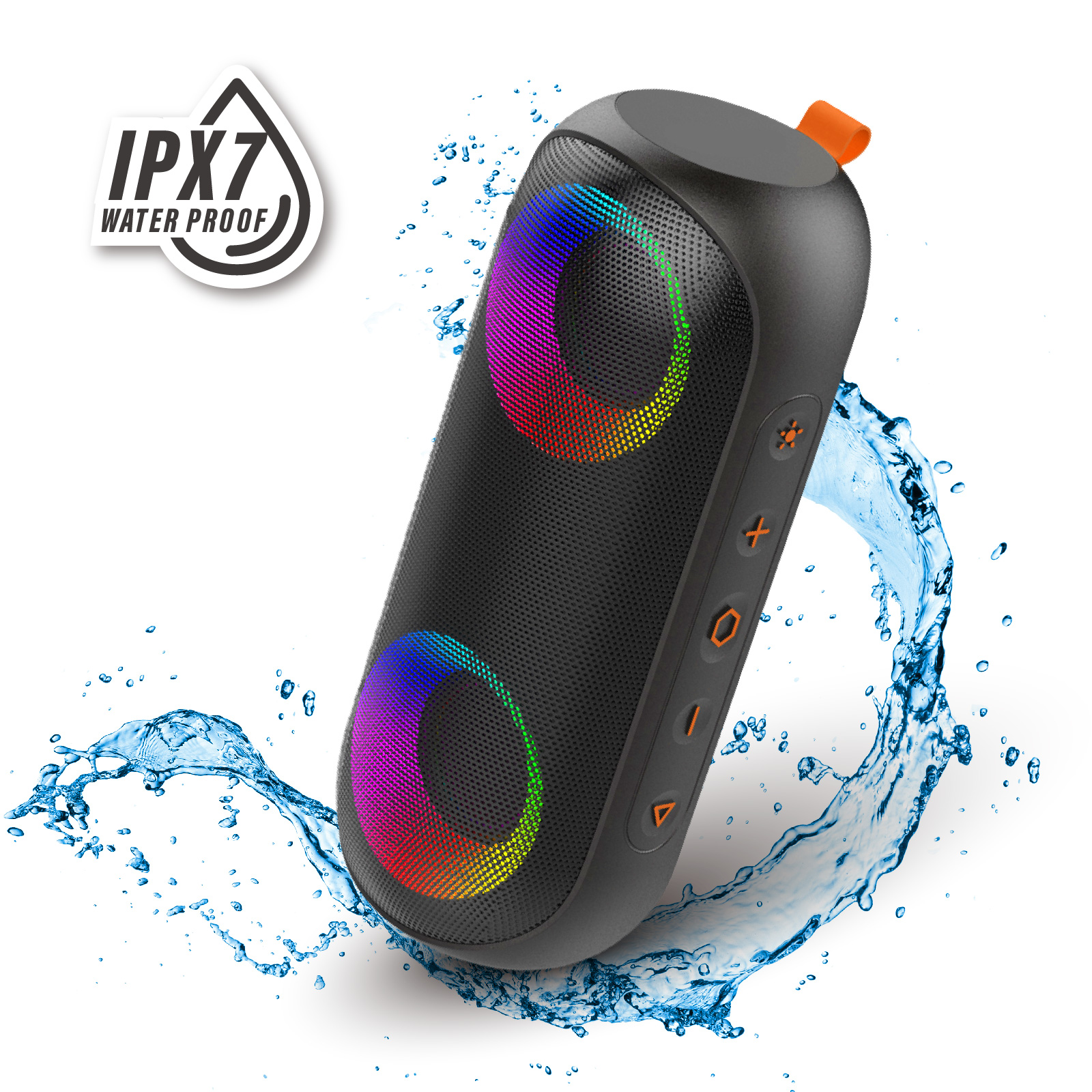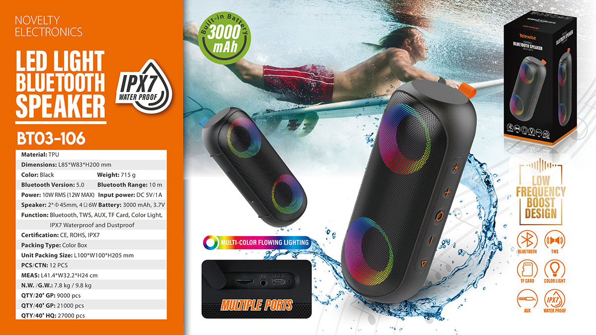 BT03-106Its Low frequency boost design, take your music with you wherever you go with our portable Bluetooth speaker. The Exclusive patent colorful lighting effects, groove to the music beats and occupy your field of vision to light up a hot party. Engineered to handle rough use and adverse weather conditions, this speaker features a durable design and an IPX7 rating for protection against water splashes and spills. It's an ideal choice for outdoor events, and is perfect for use at parties, at the pool, on the beach, while camping or hiking, and more.