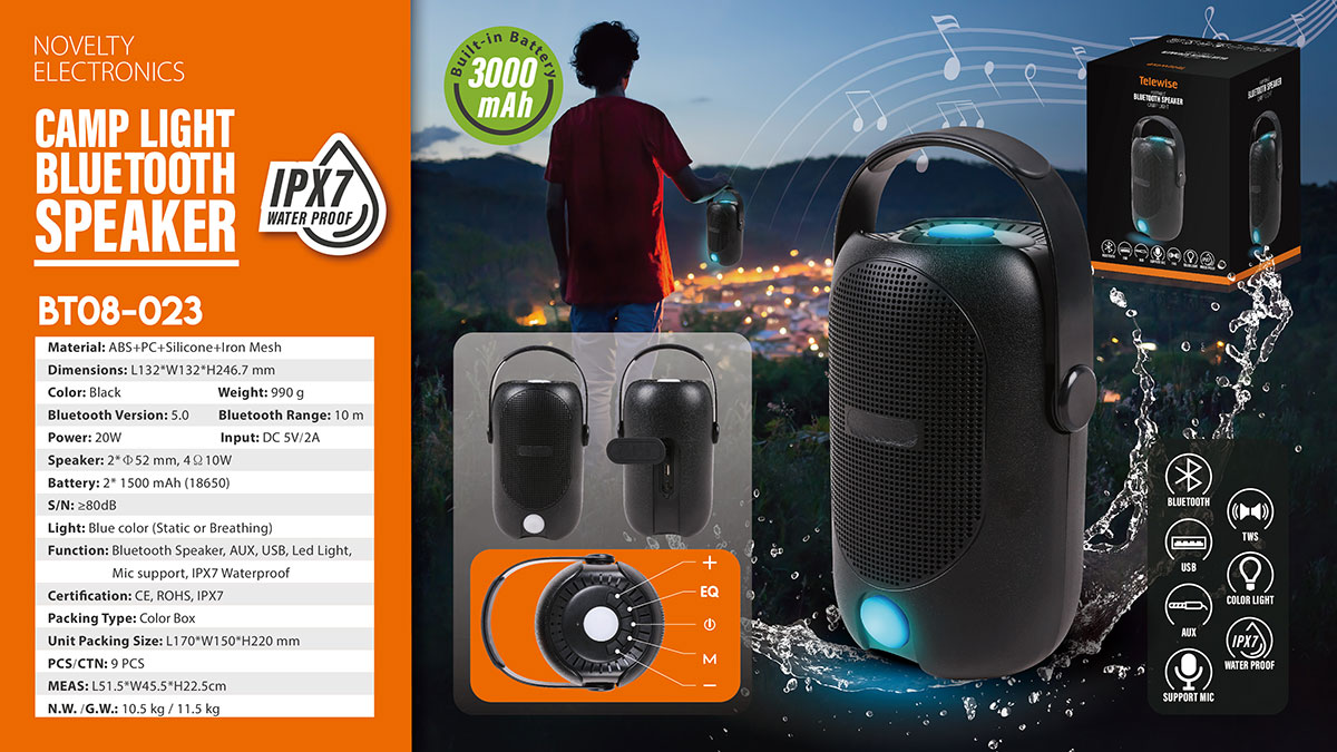BT08-023Take your music with you wherever you go with our portable LED light bluetooth speaker. Engineered to handle rough use and adverse weather conditions, this speaker features a durable design and an IPX7 rating for protection against water splashes and spills. It's an ideal choice for outdoor events, and is perfect for use at parties, at the pool, on the beach, while camping or hiking, and more.