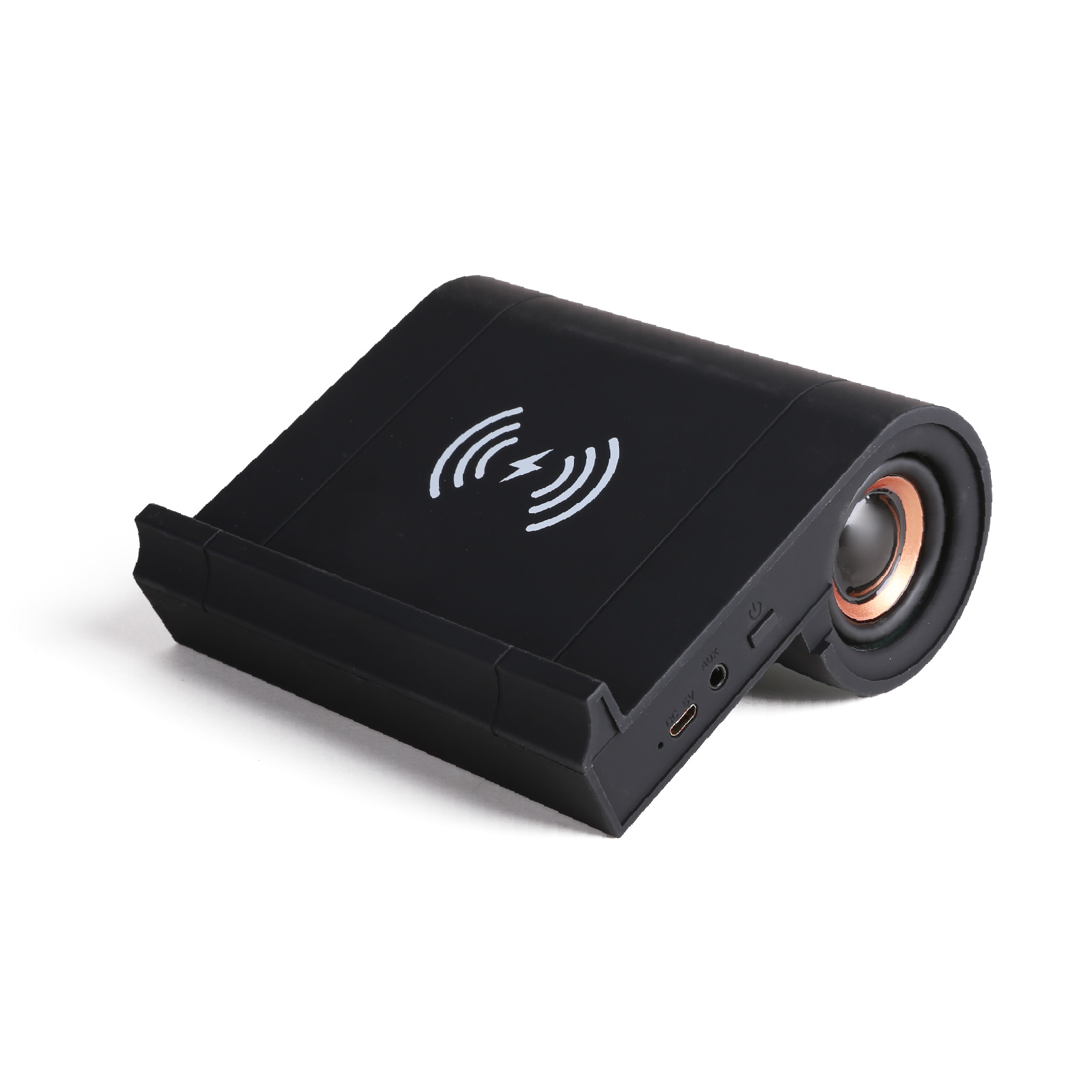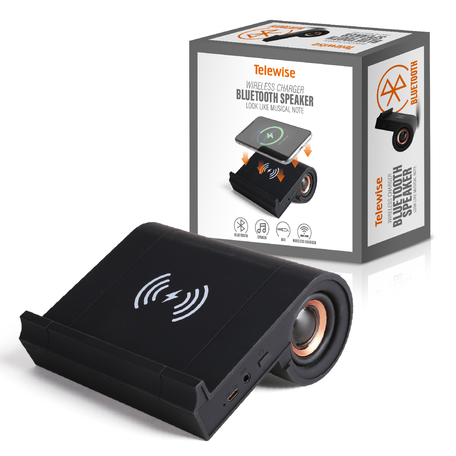 BT04-048The creative combination of wireless charging and Bluetooth speaker, Multi-tasking, give life a little more imagination. Place your phone horizontally, your phone can be charged at any time. Covered by anti-skid silicone, which can provide maximum protection for your device from any scratches and slide. Take your music with you wherever you go with our portable Bluetooth speaker, perfect for Office, Bedroom, Kitchen and Living Room.