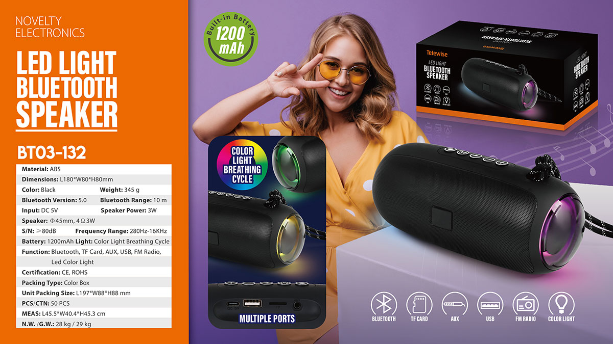 BT03-132The perfect sound quality makes the Bluetooth speaker ideal for outdoors and indoors to enjoy your music. The portable and compact design also makes the speaker used as a unique led night light, which creates a romantic atmosphere to light up your space.