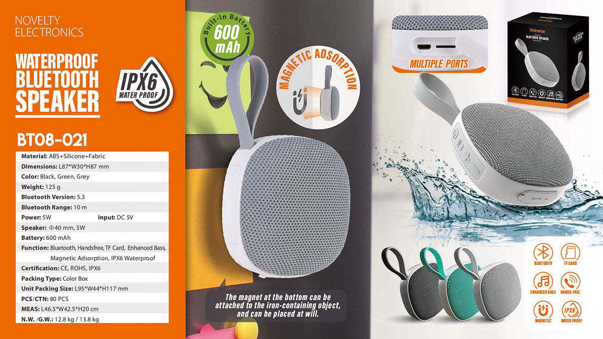 BT08-021The magnet at the bottom can be attached to the iron-containing object, and can be placed at will. The perfect sound quality makes the Bluetooth speaker ideal for outdoors and indoors to enjoy your music.