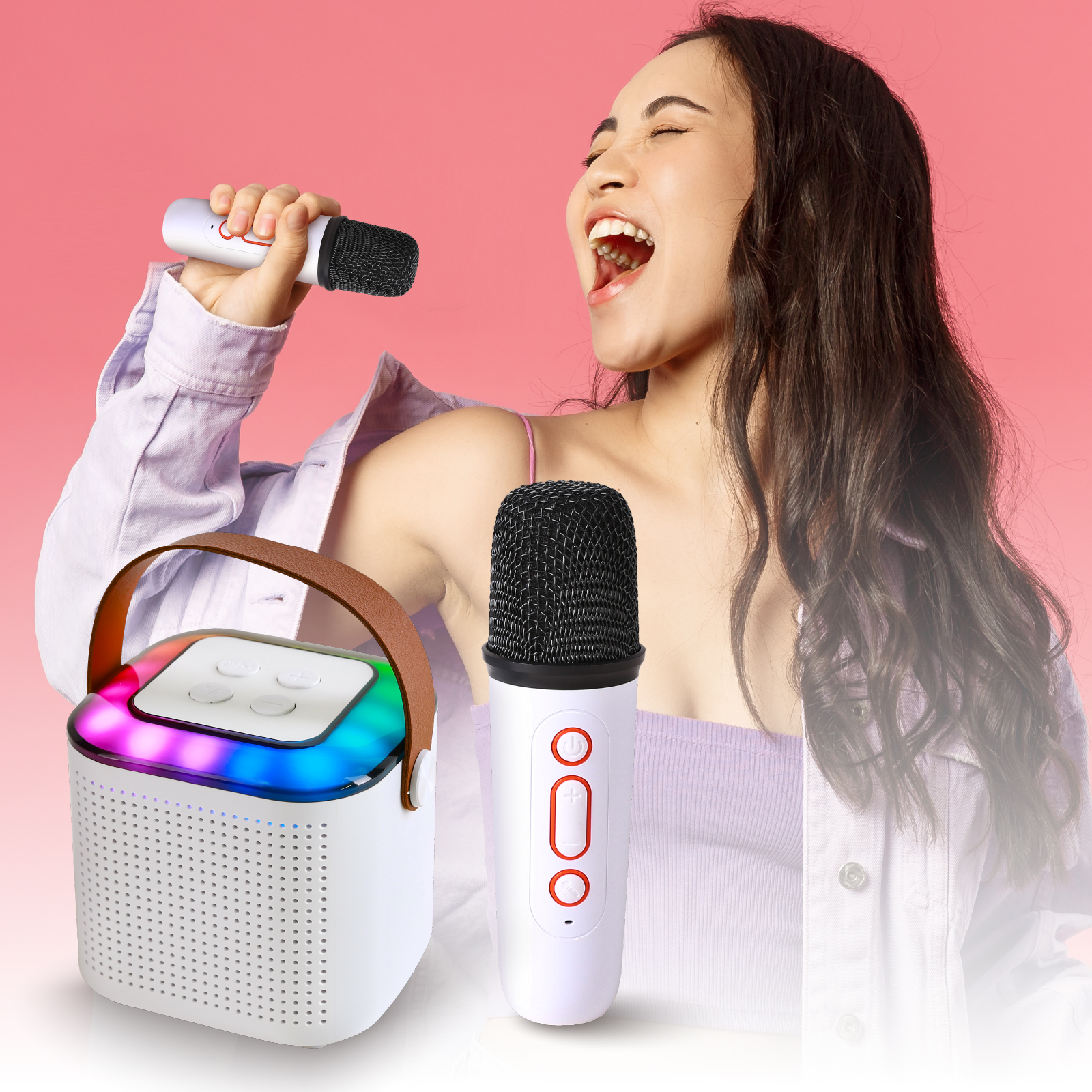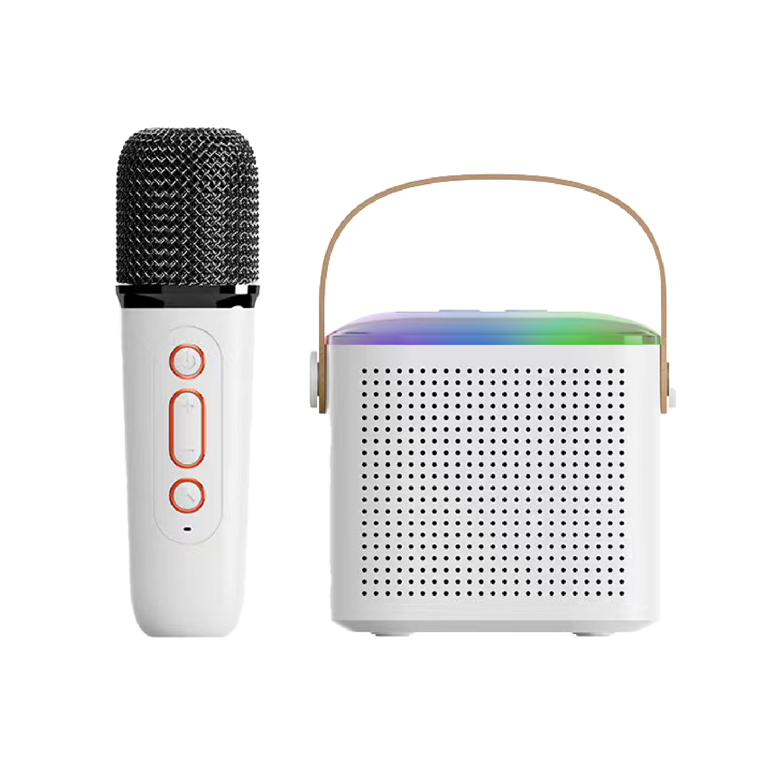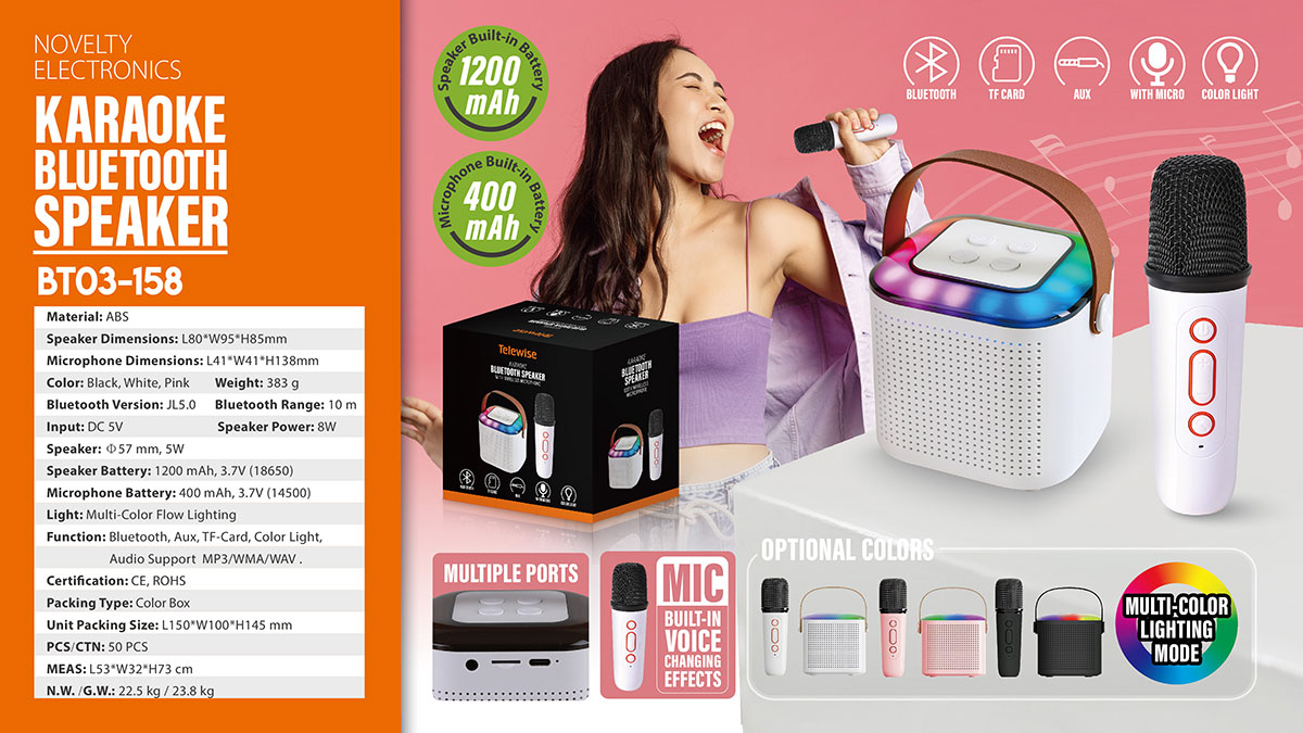 BT03-158Mini karaoke bluetooth speaker set includes portable speaker & small and exquisite microphones ( with different sound effects). Lightweight karaoke machine with internal rechargeable battery,With a leather wristband, this retro speaker is sturdy and portable to take anywhere,Perfect for family outing, karaoke party, house party, church, hotel conference room, classroom, lecture room, gymnasium, fitness center, workspace, playroom and any party venue.