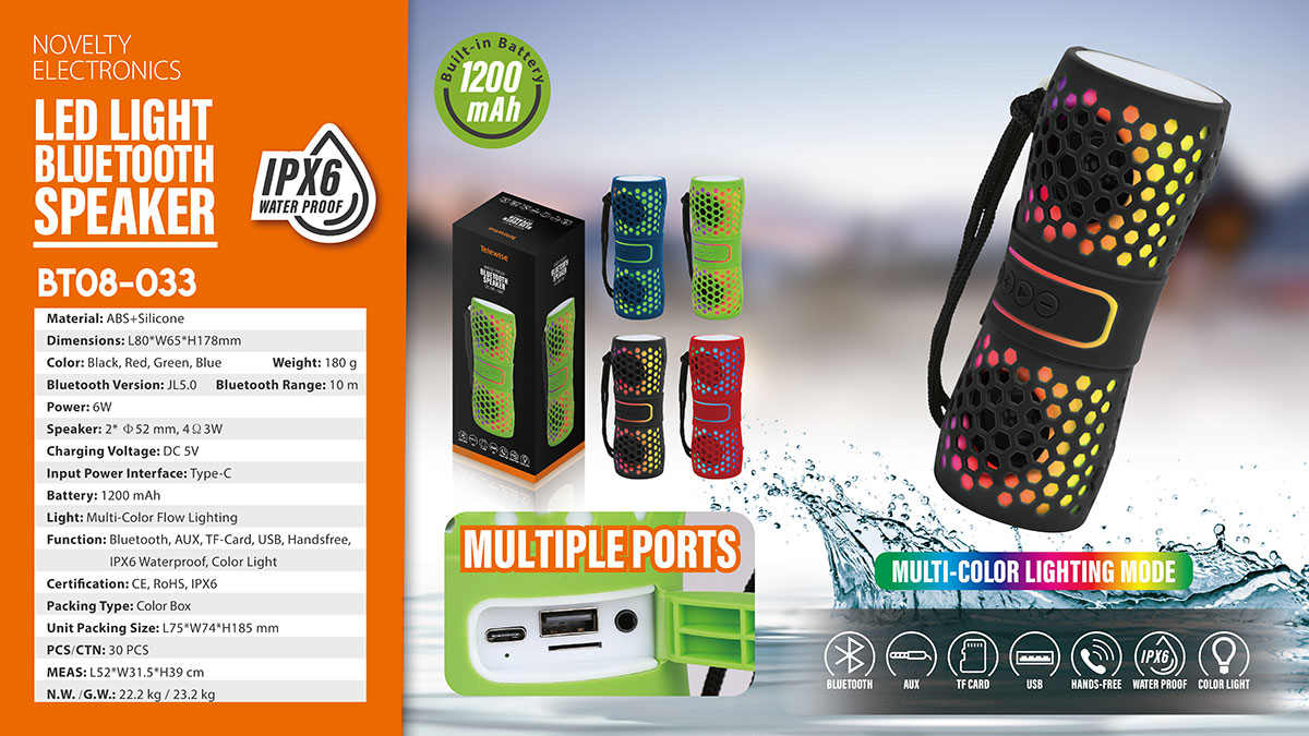 BT08-033The perfect sound quality makes the Bluetooth speaker ideal for outdoors and indoors to enjoy your music. Engineered to handle rough use and adverse weather conditions, this speaker features a durable design and an IPX6 rating for protection against water splashes and spills