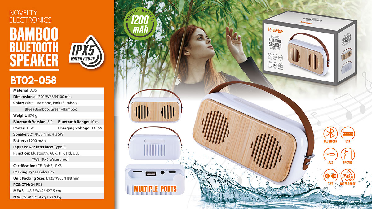 BT02-058The Bluetooth speaker supports Bluetooth Connection, 3.5mm aux cable, TF Card & USB. You can enjoy music for multiple connection ways. Engineered to handle rough use and adverse weather conditions, this speaker features a durable design and an IPX5 rating for protection against water splashes and spills. It's an ideal choice for outdoor events, and is perfect for use at parties, at the pool, on the beach, while camping or hiking, and more.