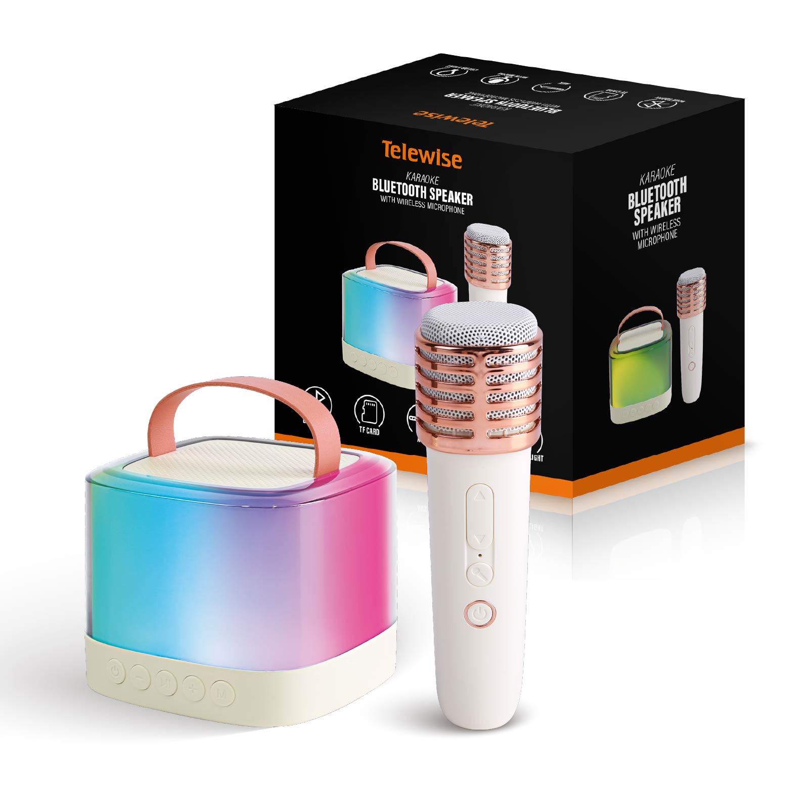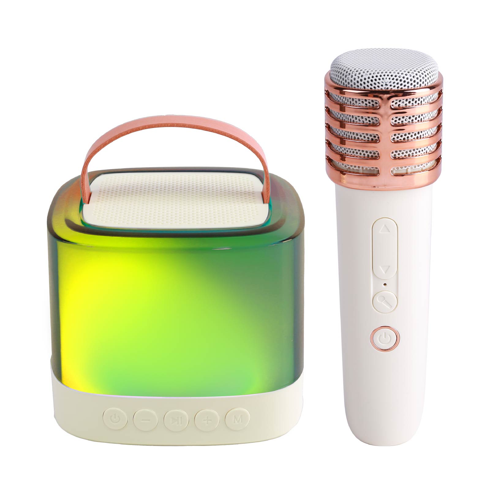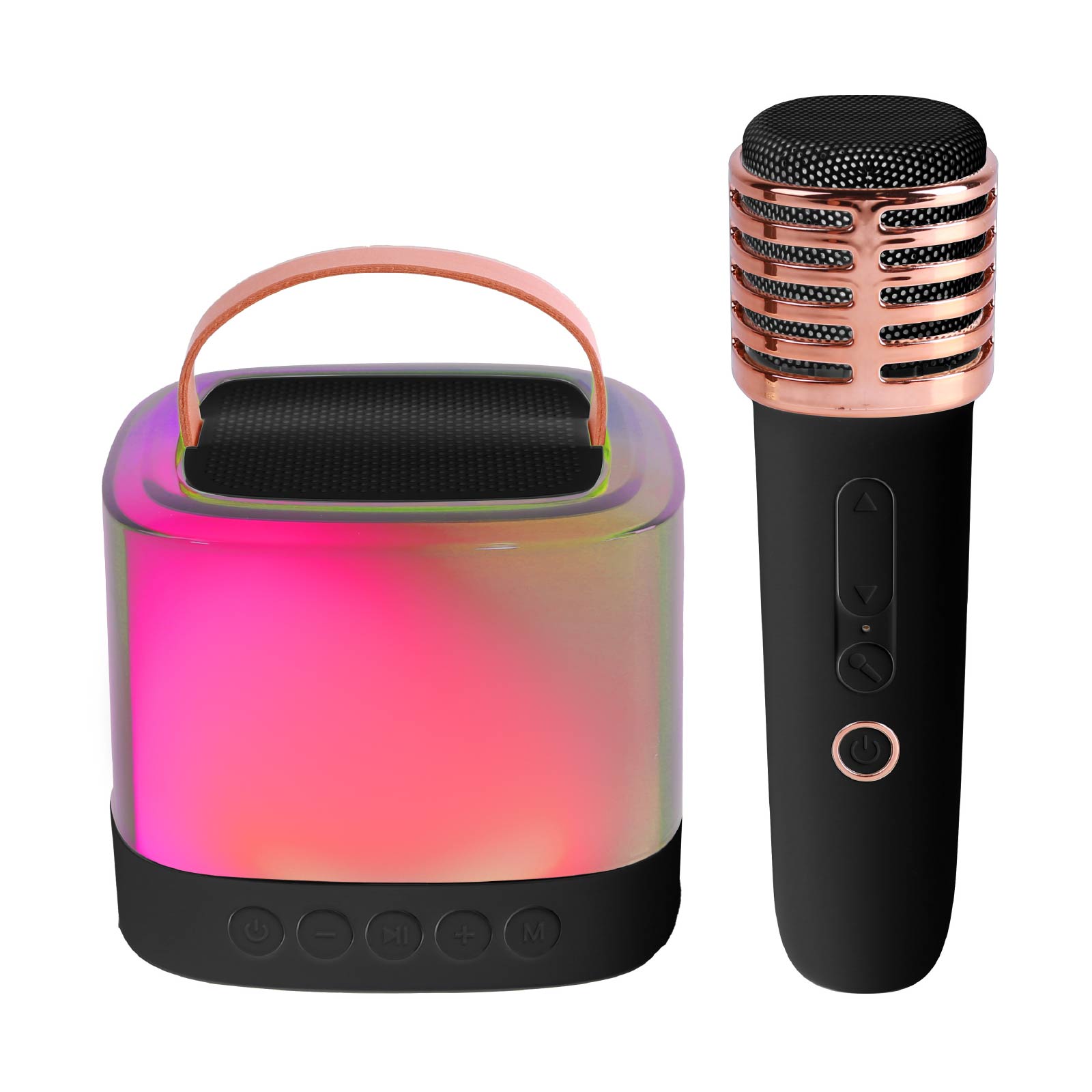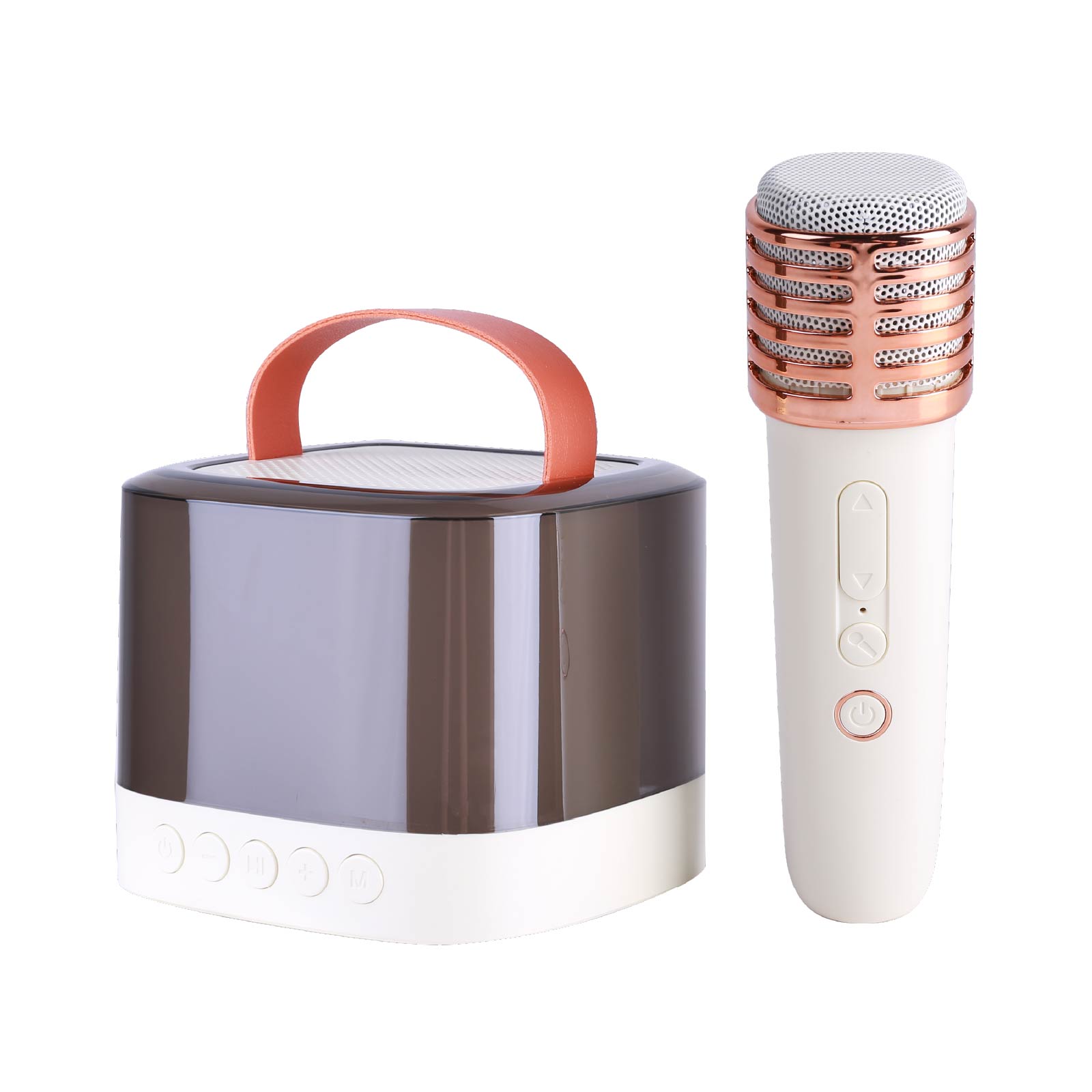 BT03-152Mini karaoke bluetooth speaker set includes portable speaker & small and exquisite microphones ( with different sound effects). Lightweight karaoke machine with internal rechargeable battery,With a leather wristband, this retro speaker is sturdy and portable to take anywhere,Perfect for family outing, karaoke party, house party, church, hotel conference room, classroom, lecture room, gymnasium, fitness center, workspace, playroom and any party venue.