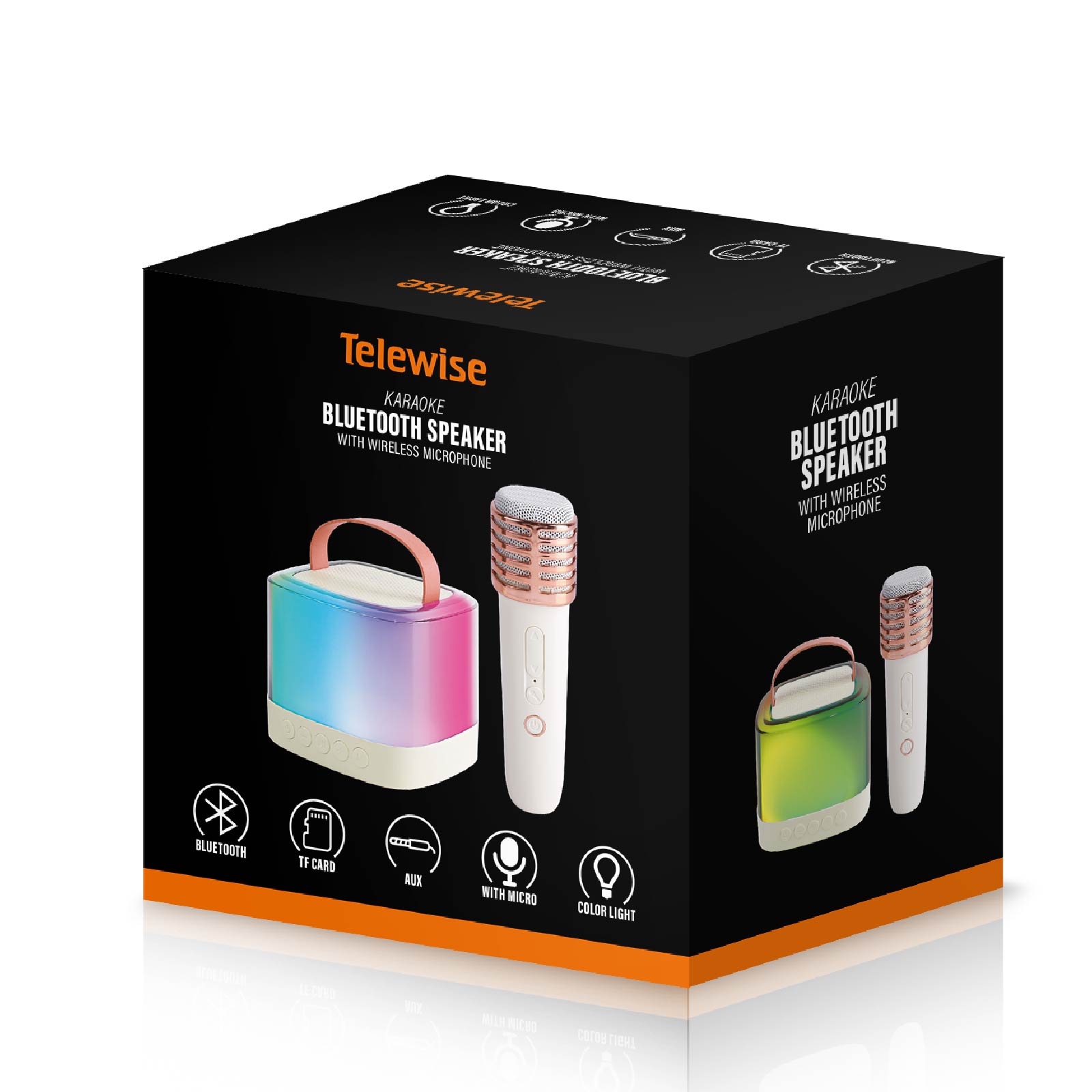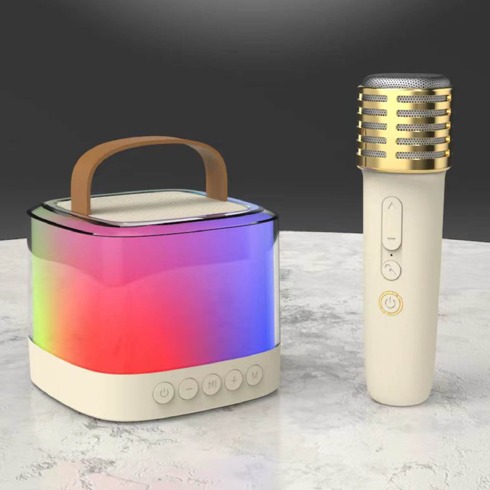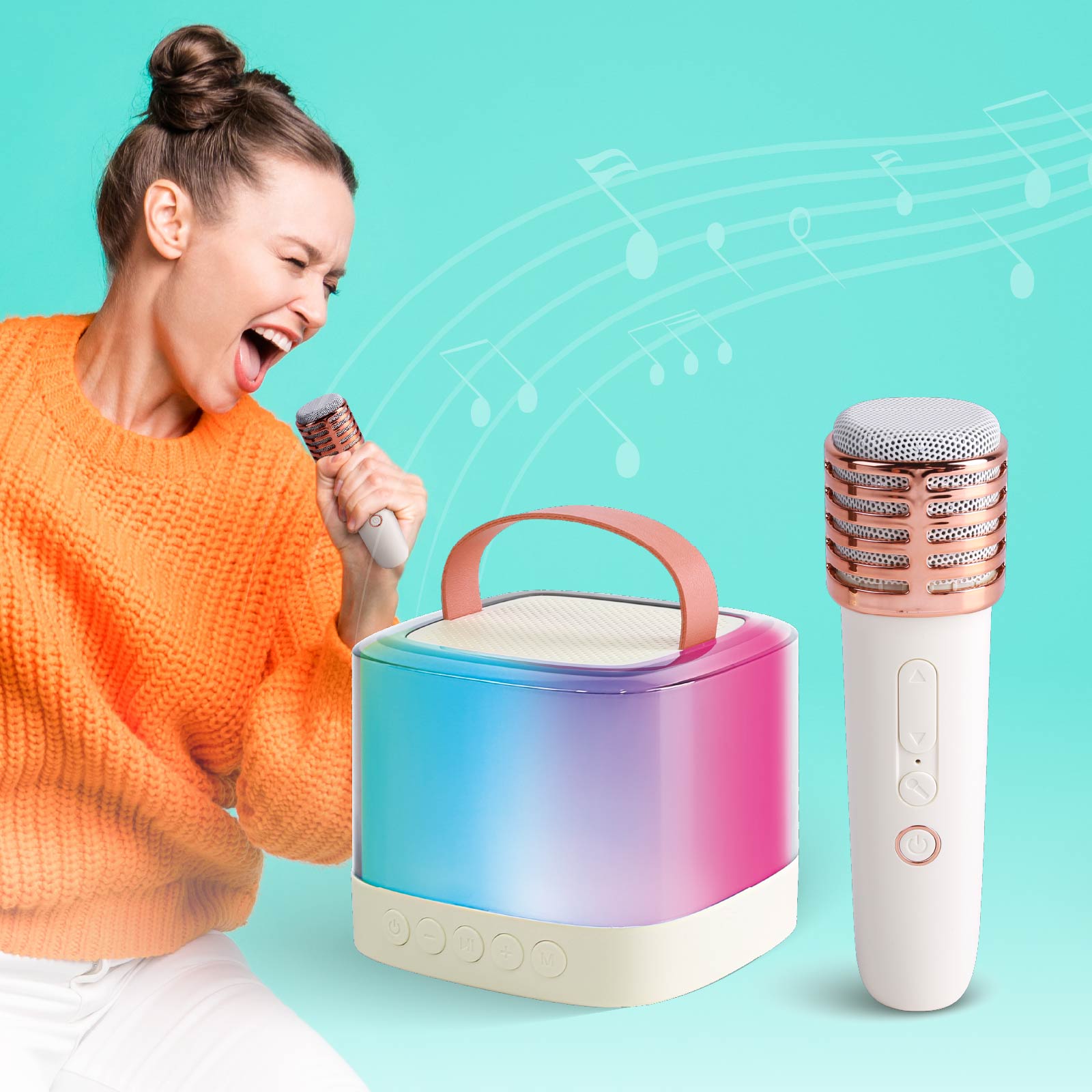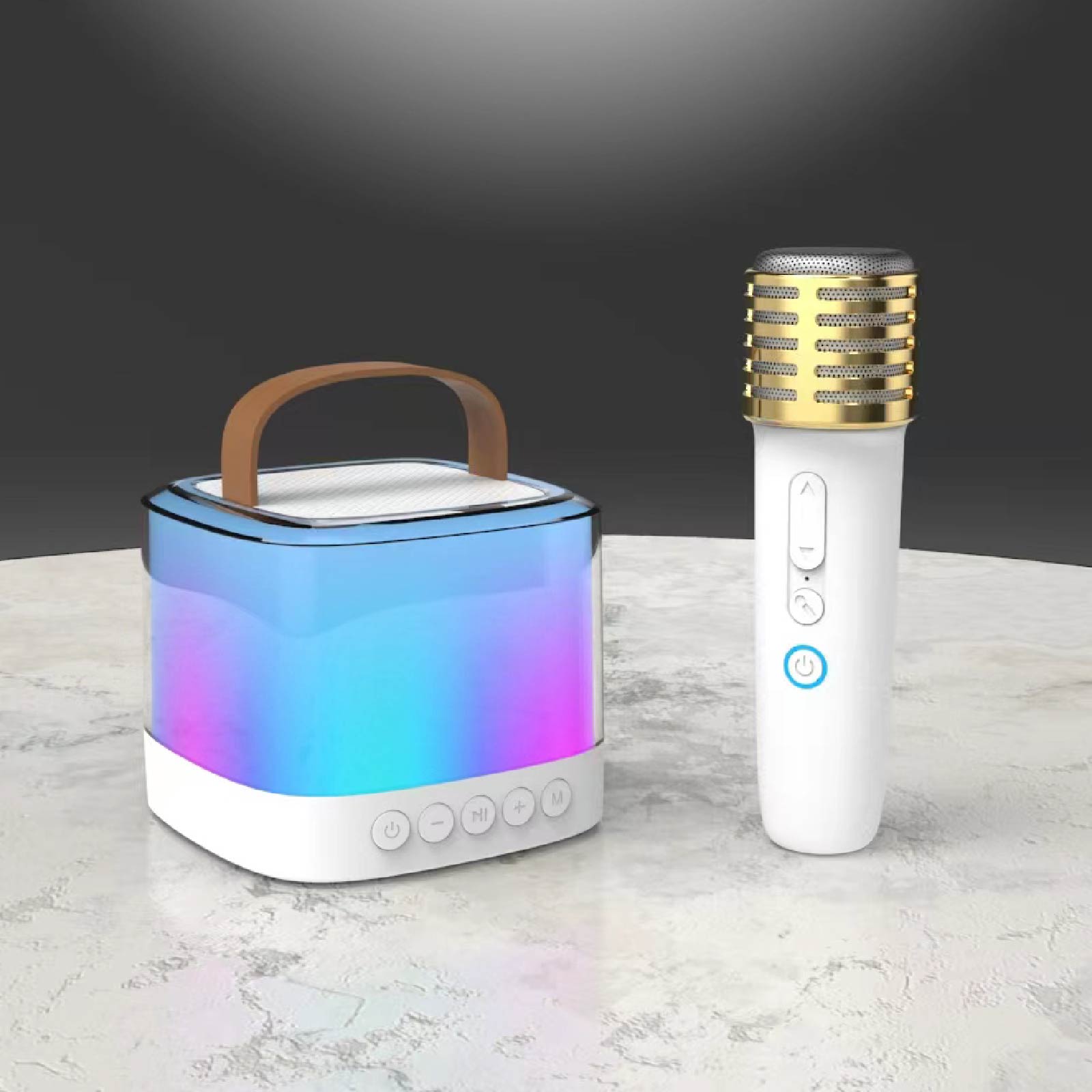 BT03-152Mini karaoke bluetooth speaker set includes portable speaker & small and exquisite microphones ( with different sound effects). Lightweight karaoke machine with internal rechargeable battery,With a leather wristband, this retro speaker is sturdy and portable to take anywhere,Perfect for family outing, karaoke party, house party, church, hotel conference room, classroom, lecture room, gymnasium, fitness center, workspace, playroom and any party venue.