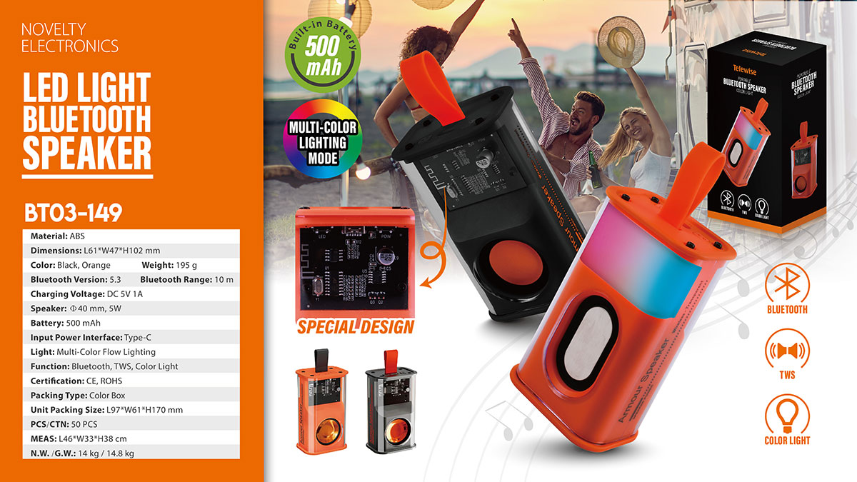 BT03-149The perfect sound quality makes the Bluetooth speaker ideal for outdoors and indoors to enjoy your music. The portable and compact design also makes the speaker used as a unique led night light, which creates a romantic atmosphere to light up your space.