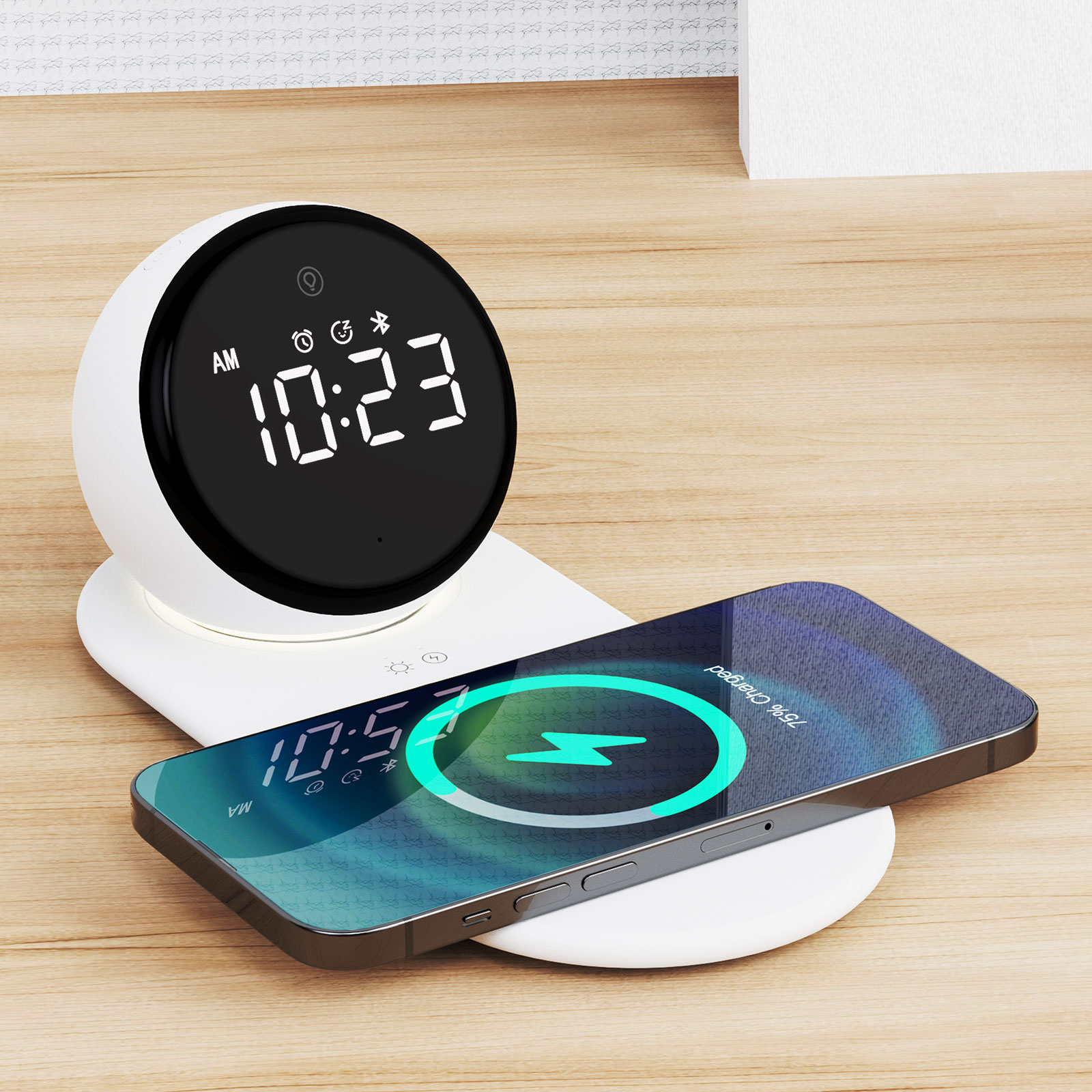 Bluetooth speaker, wireless charger, alarm Clock are integrated into one design.