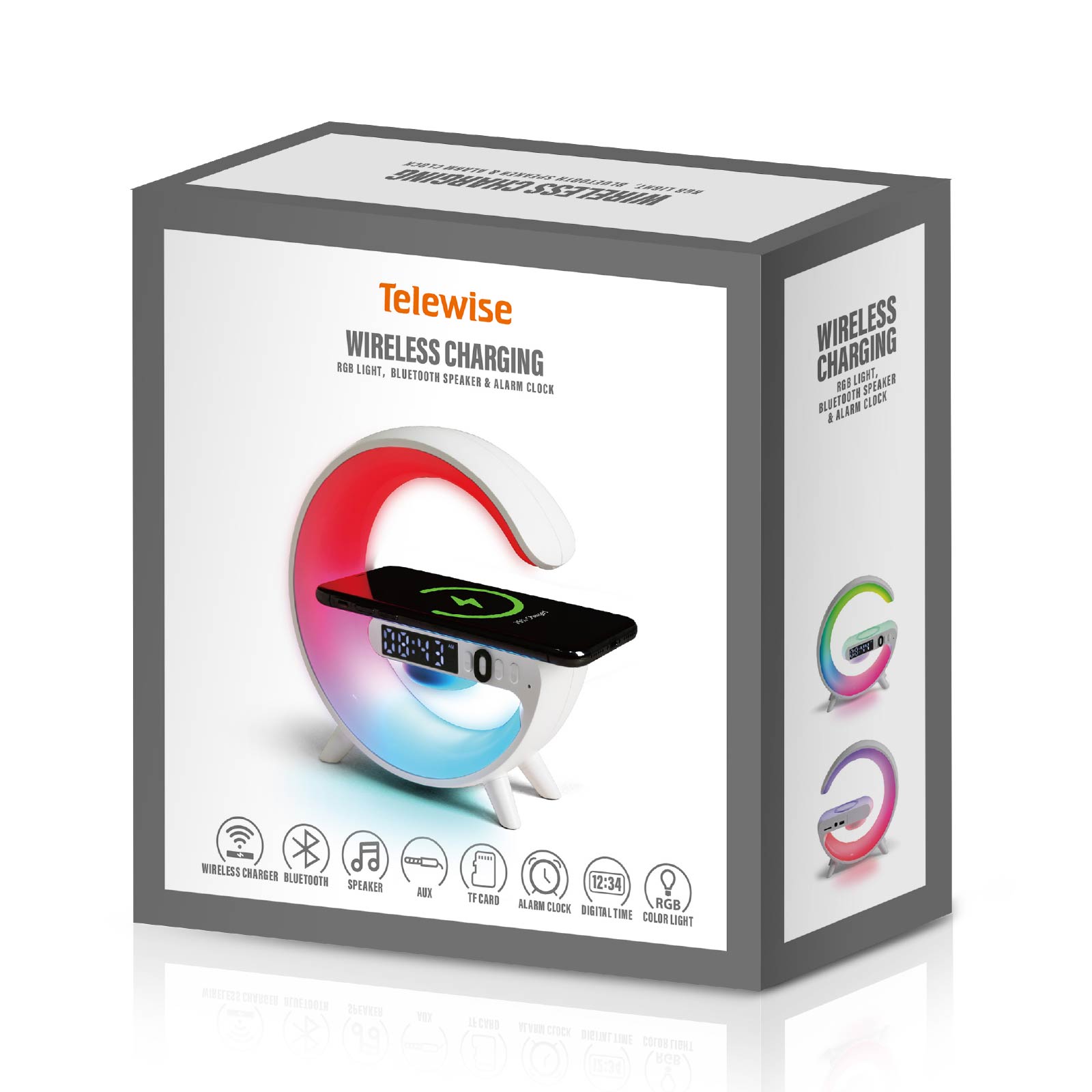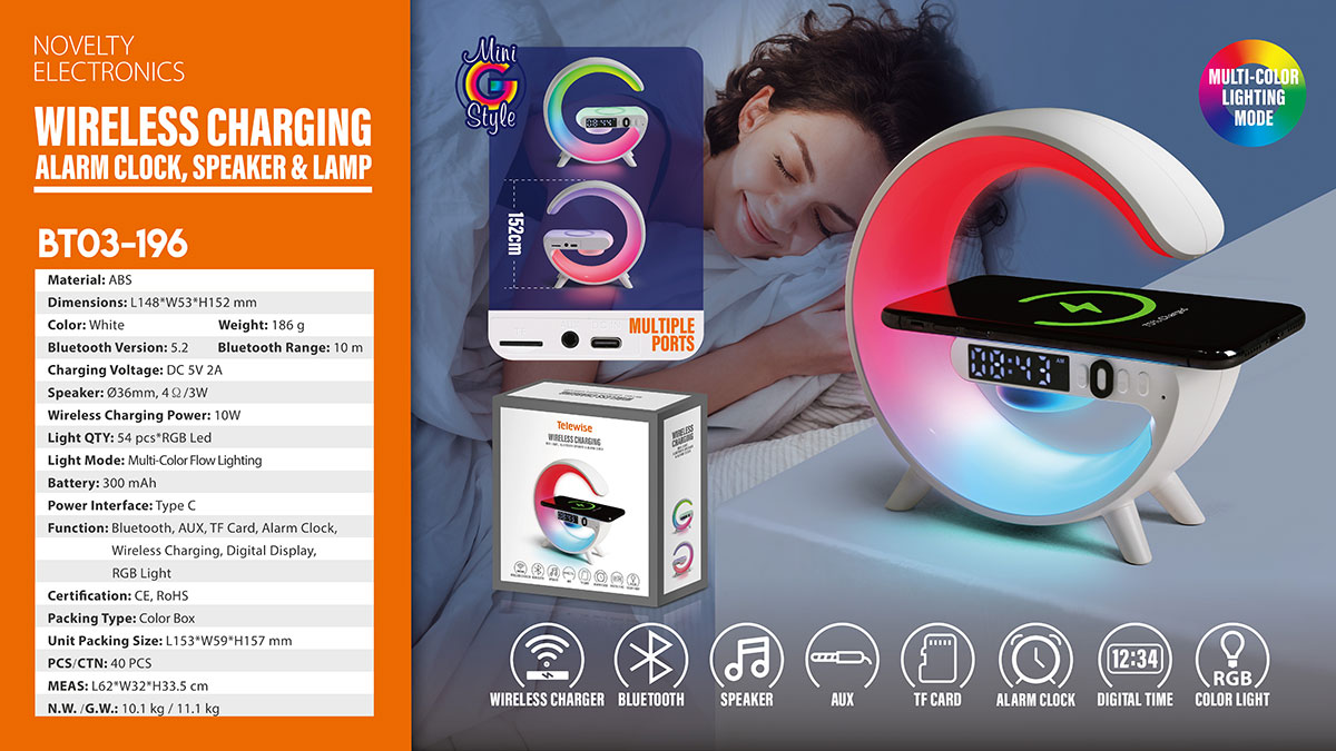- Function : Bluetooth, AUX, TF Card, Alarm clock, Wireless Charging, Digital Display, RGB Light