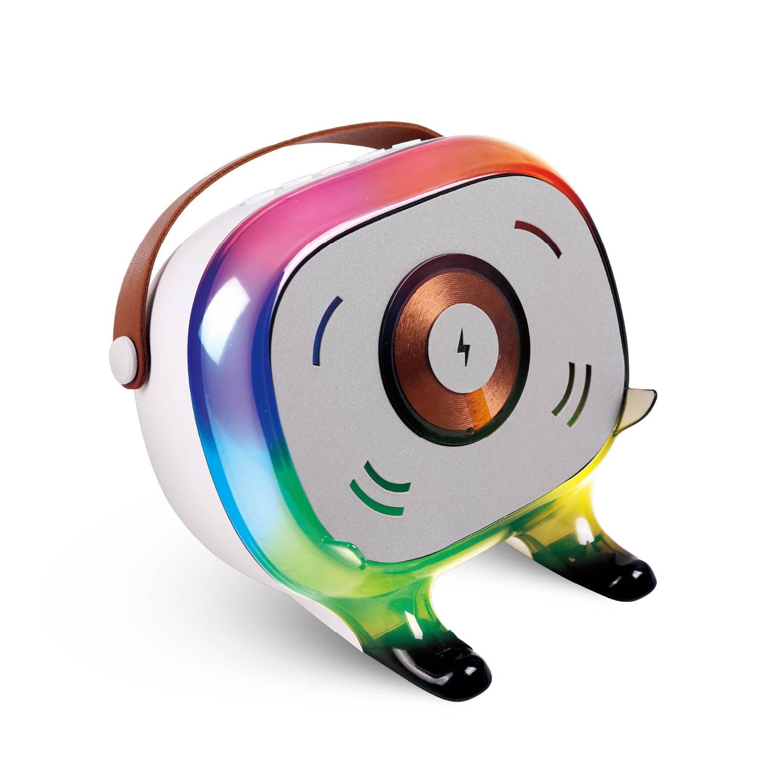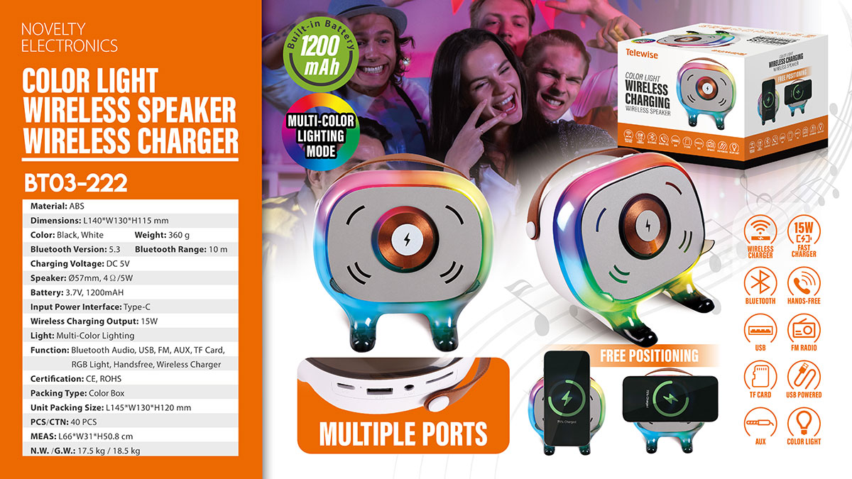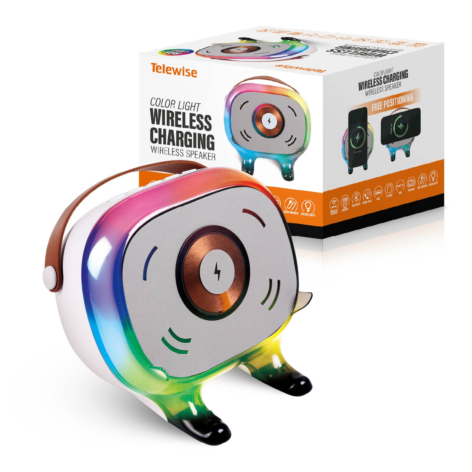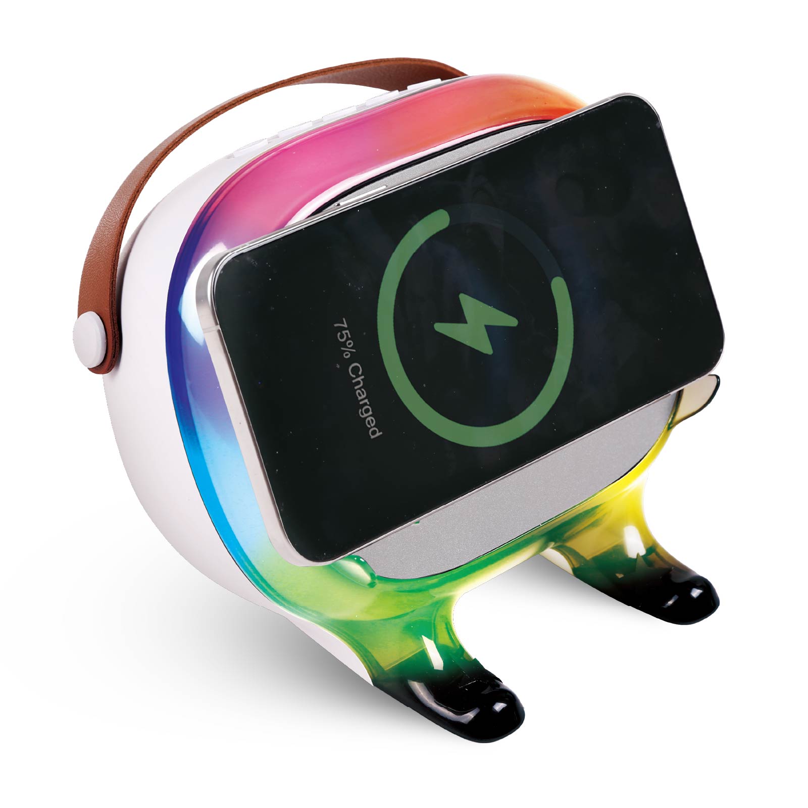 BT03-222Wireless charging speaker with a built-in nightlight feature. Illuminate your space with soft, soothing light while wirelessly charging your devices and enjoying your favorite music. It's the perfect blend of convenience and ambiance, making your nights more relaxing and enjoyable.