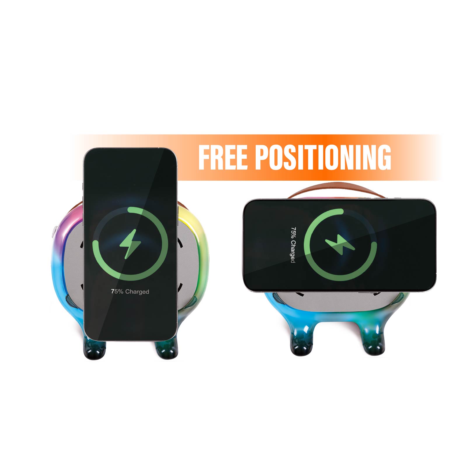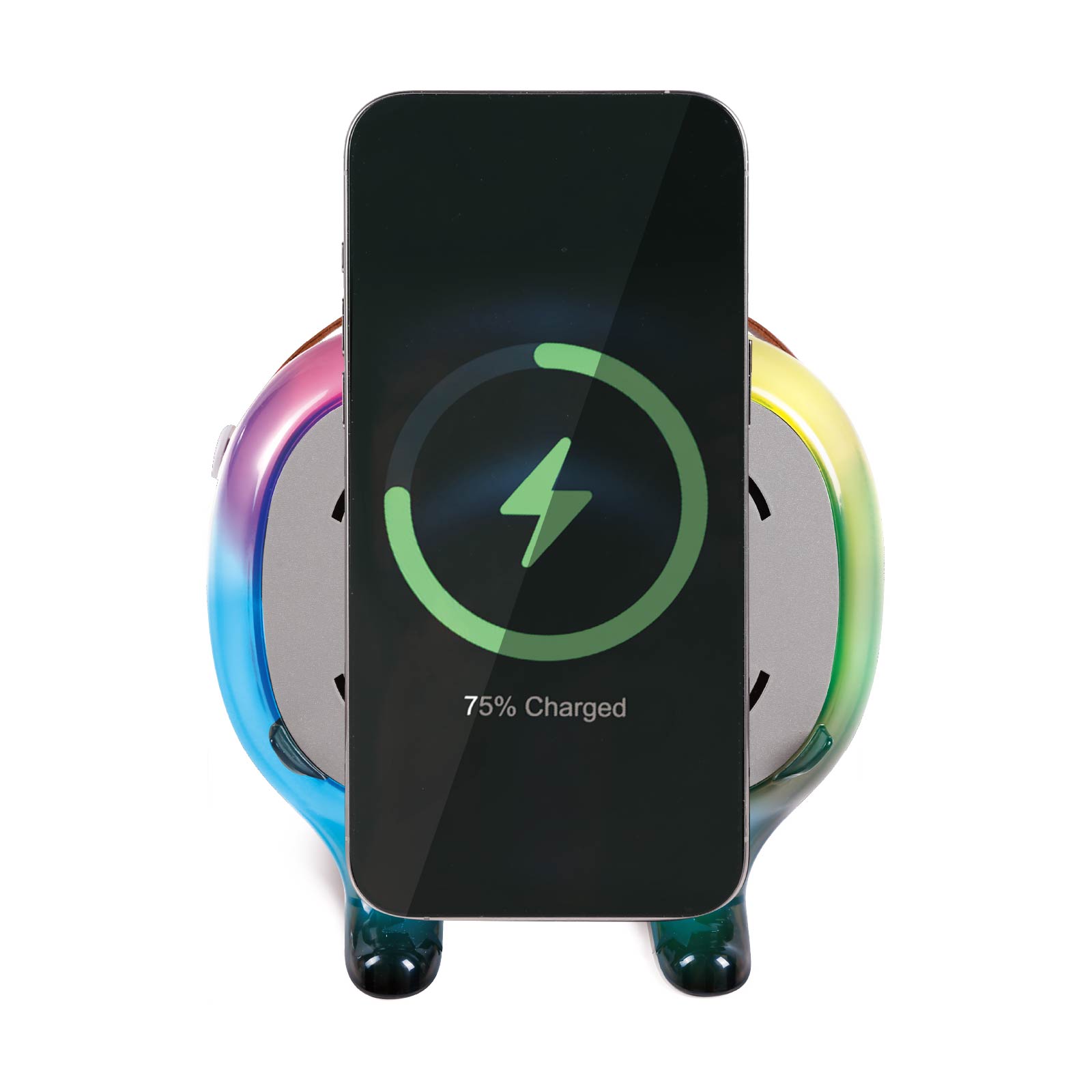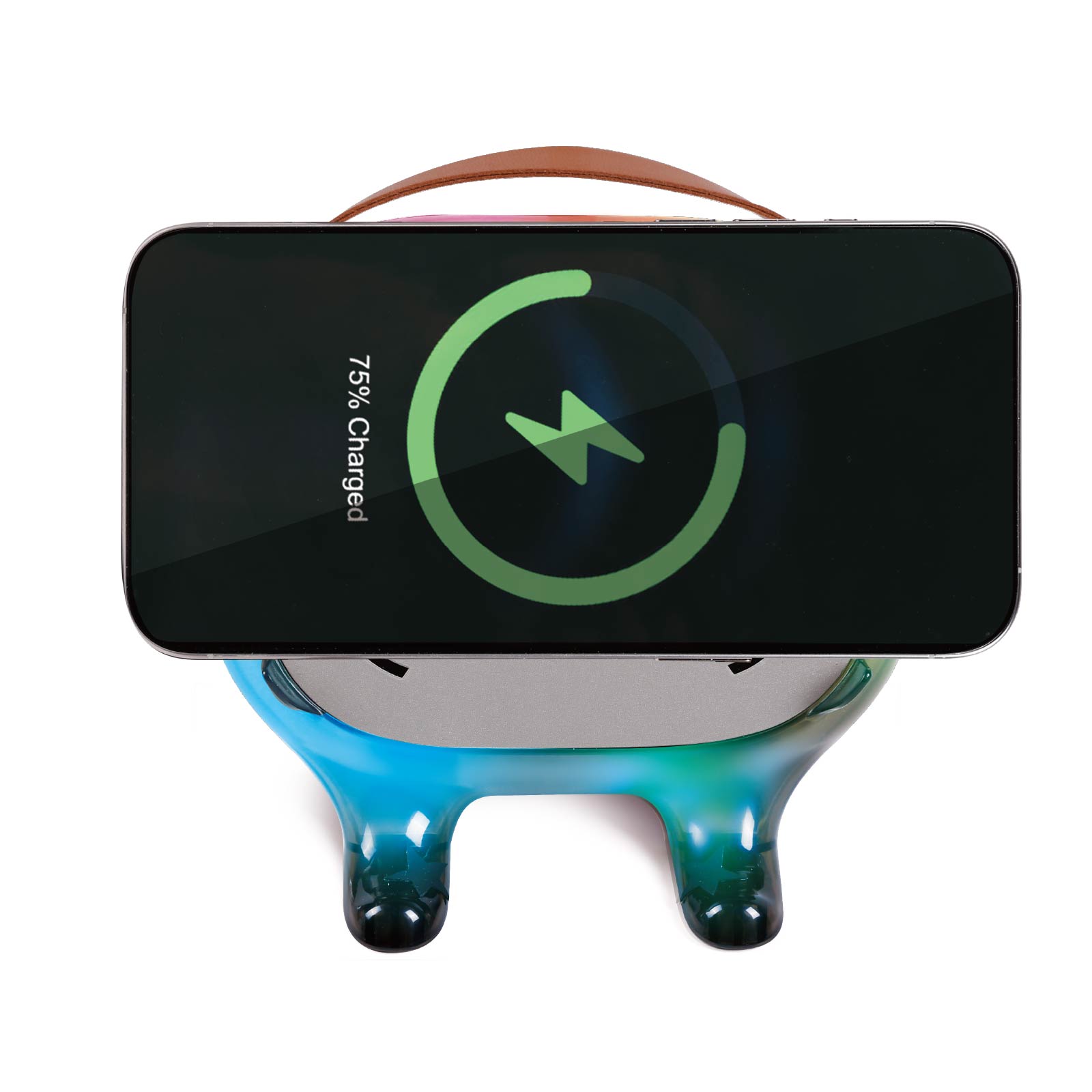 BT03-222Wireless charging speaker with a built-in nightlight feature. Illuminate your space with soft, soothing light while wirelessly charging your devices and enjoying your favorite music. It's the perfect blend of convenience and ambiance, making your nights more relaxing and enjoyable.