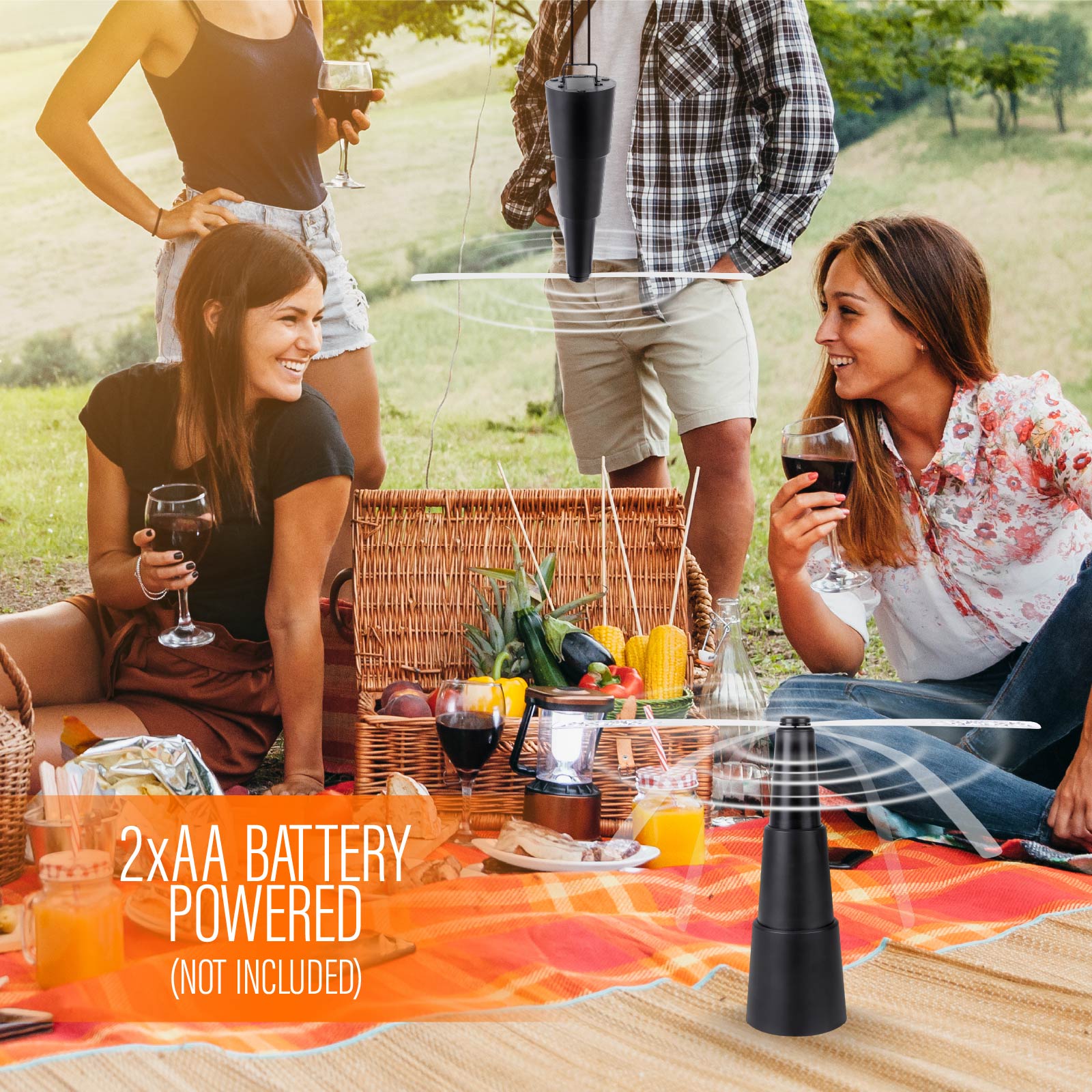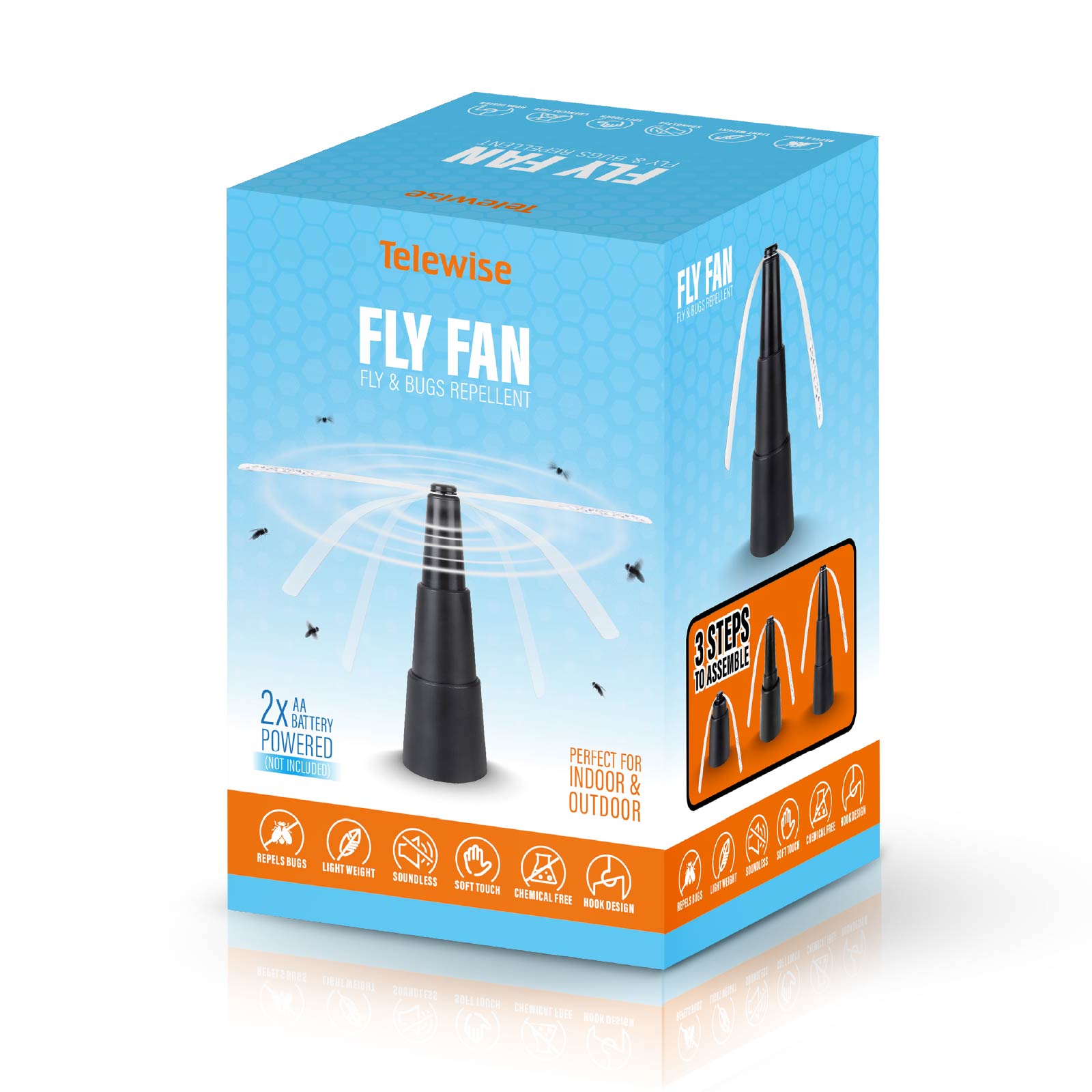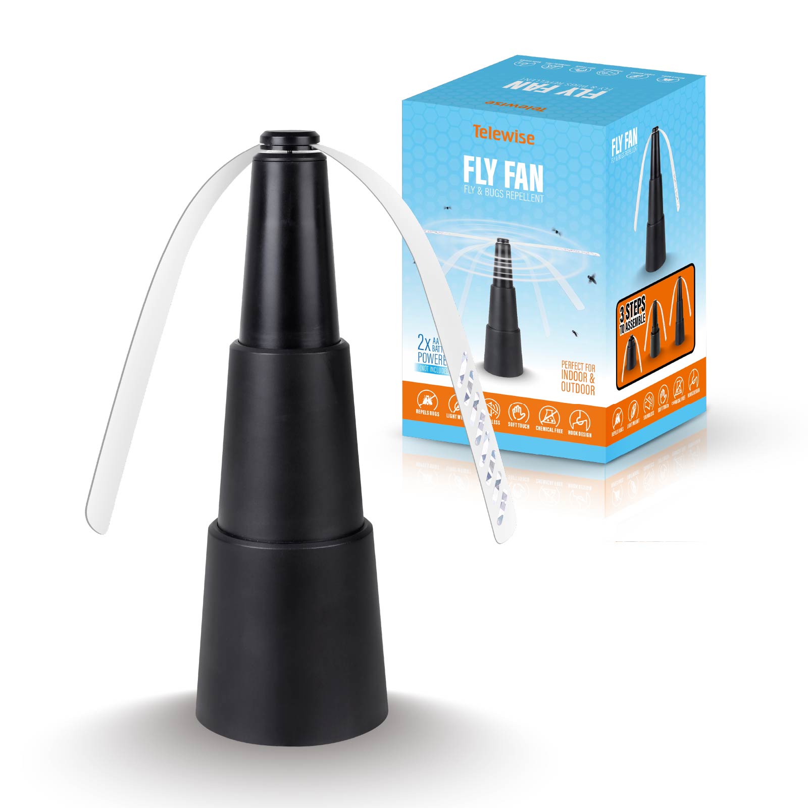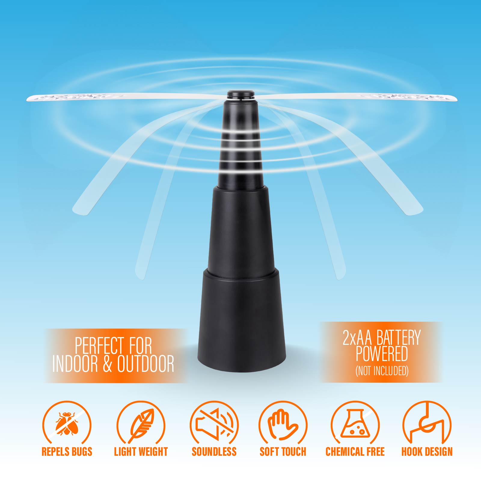 - Function : Repels Bugs, Soft Fan Blades, Soundless Spinning, Chemical Free, Hidden Hook Design, Light Weight, Scalable & Portable,2xAA Battery Powered