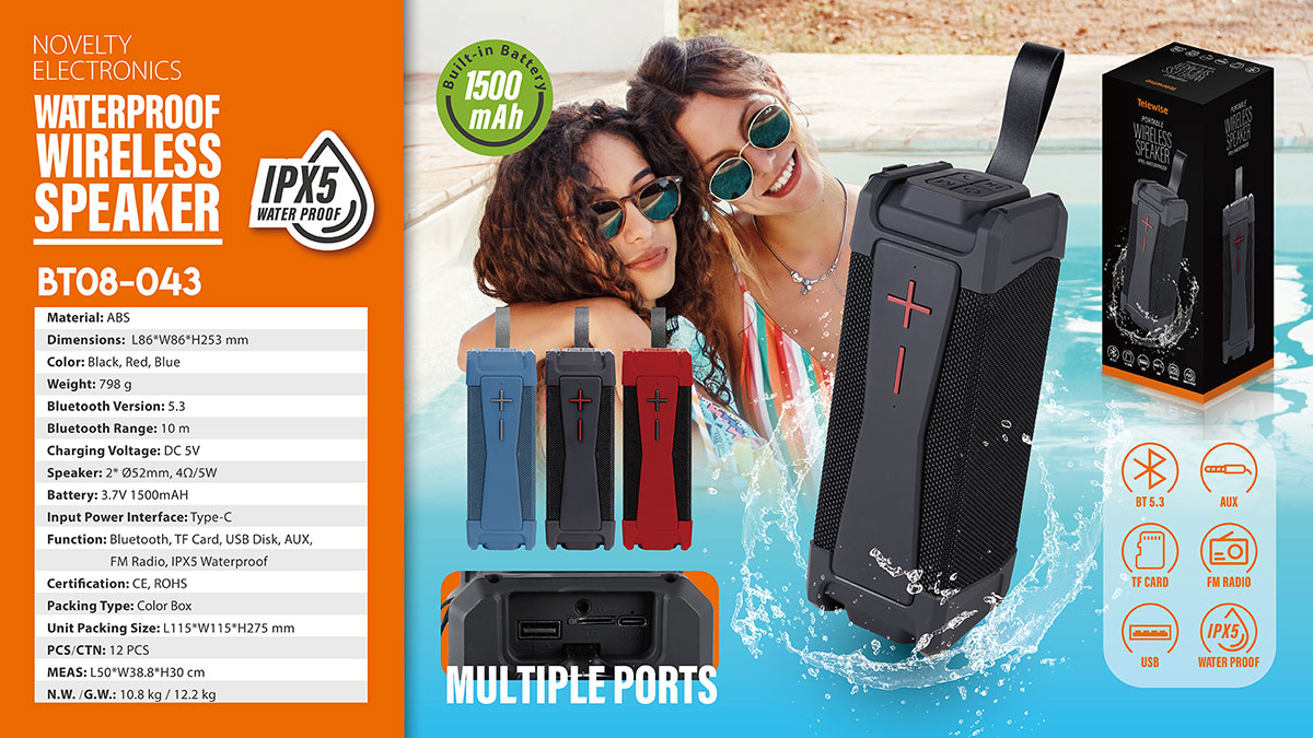 BT08-043The perfect sound quality makes the Bluetooth speaker ideal for outdoors and indoors to enjoy your music.