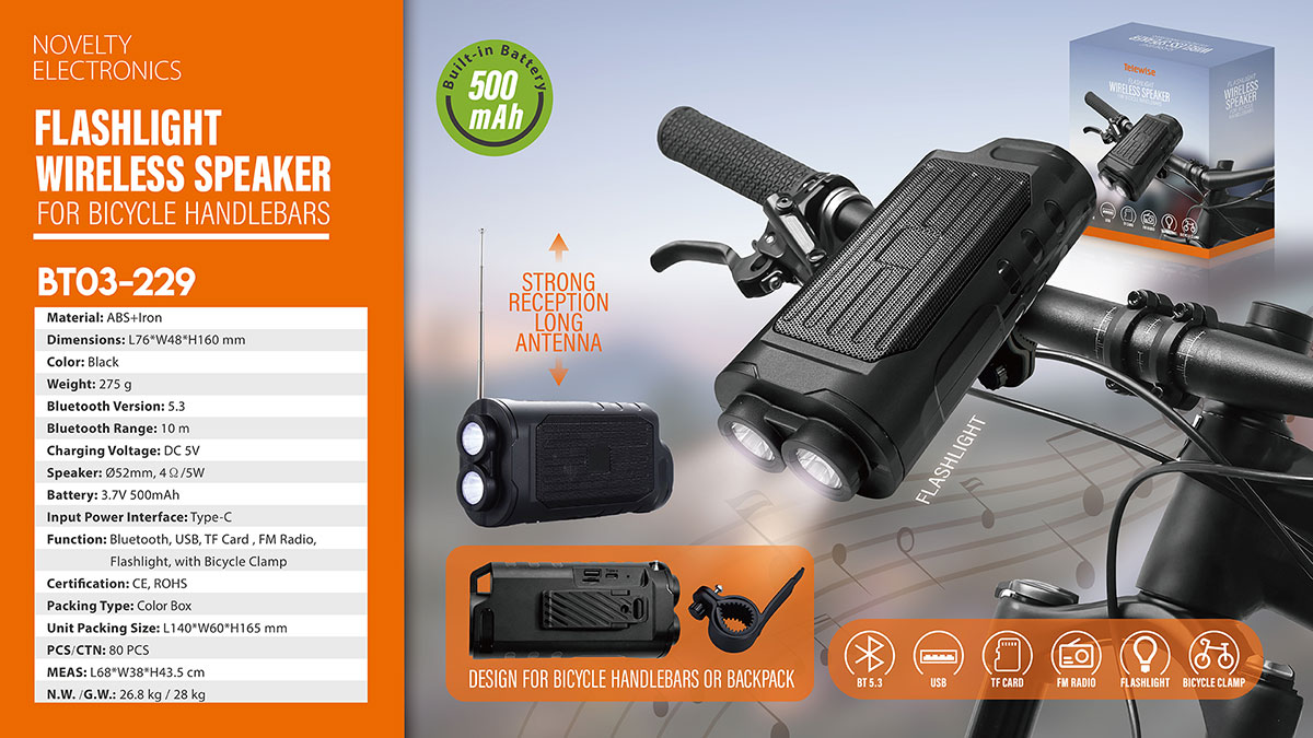 BT03-229The bluetooth speaker is design for your cycling bike handlebars/backpack. It has flashlight/ multiple play ways/ FM Radio. All-in-1 design with portable size made life more convenient on the road, perfect portable speakers wireless for all kind of activities: biking, travel, cycling, fishing, hiking, camping etc.