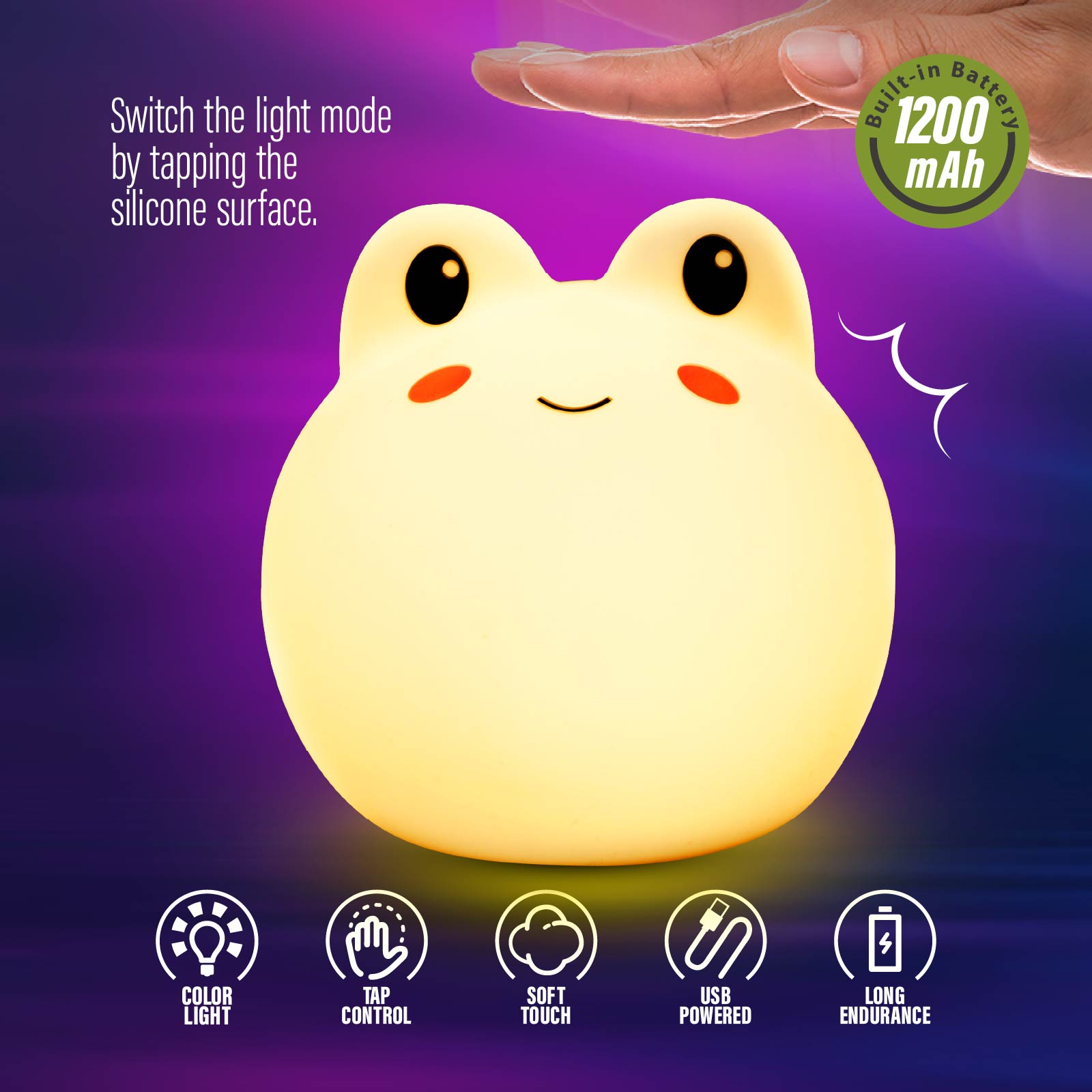 LG03-060Super cute night light, soothing glow creates a relaxing bedtime experience which can protect your kids from darkness and help them fall asleep. 7-color breathing mode and single color mode. You can change its mode by patting the silicone surface.
