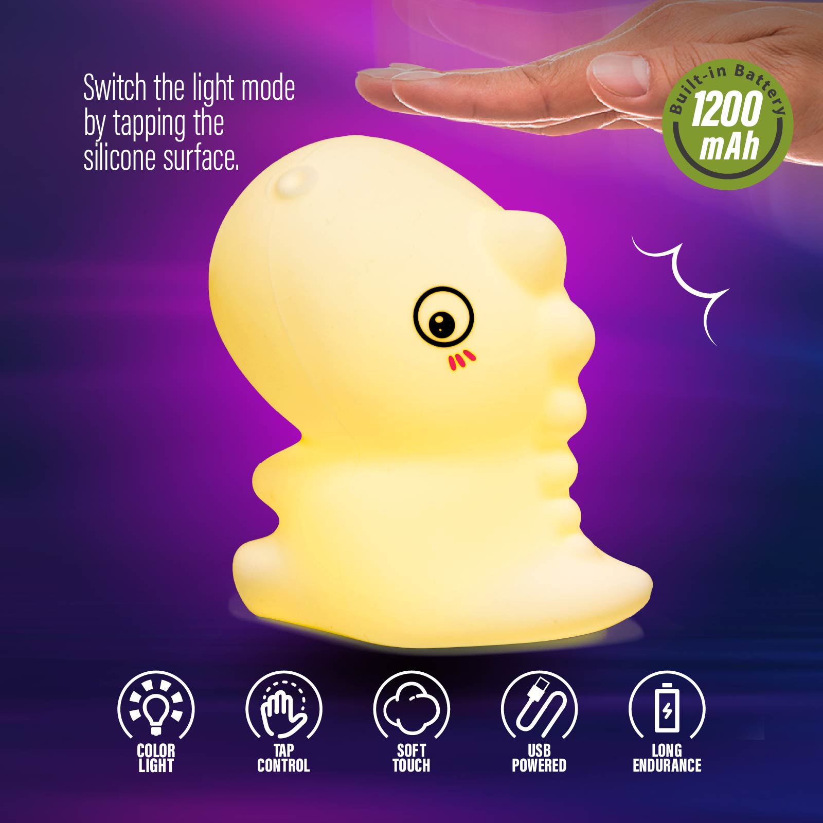 LG03-062Super cute night light, soothing glow creates a relaxing bedtime experience which can protect your kids from darkness and help them fall asleep. 7-color breathing mode and single color mode. You can change its mode by patting the silicone surface.