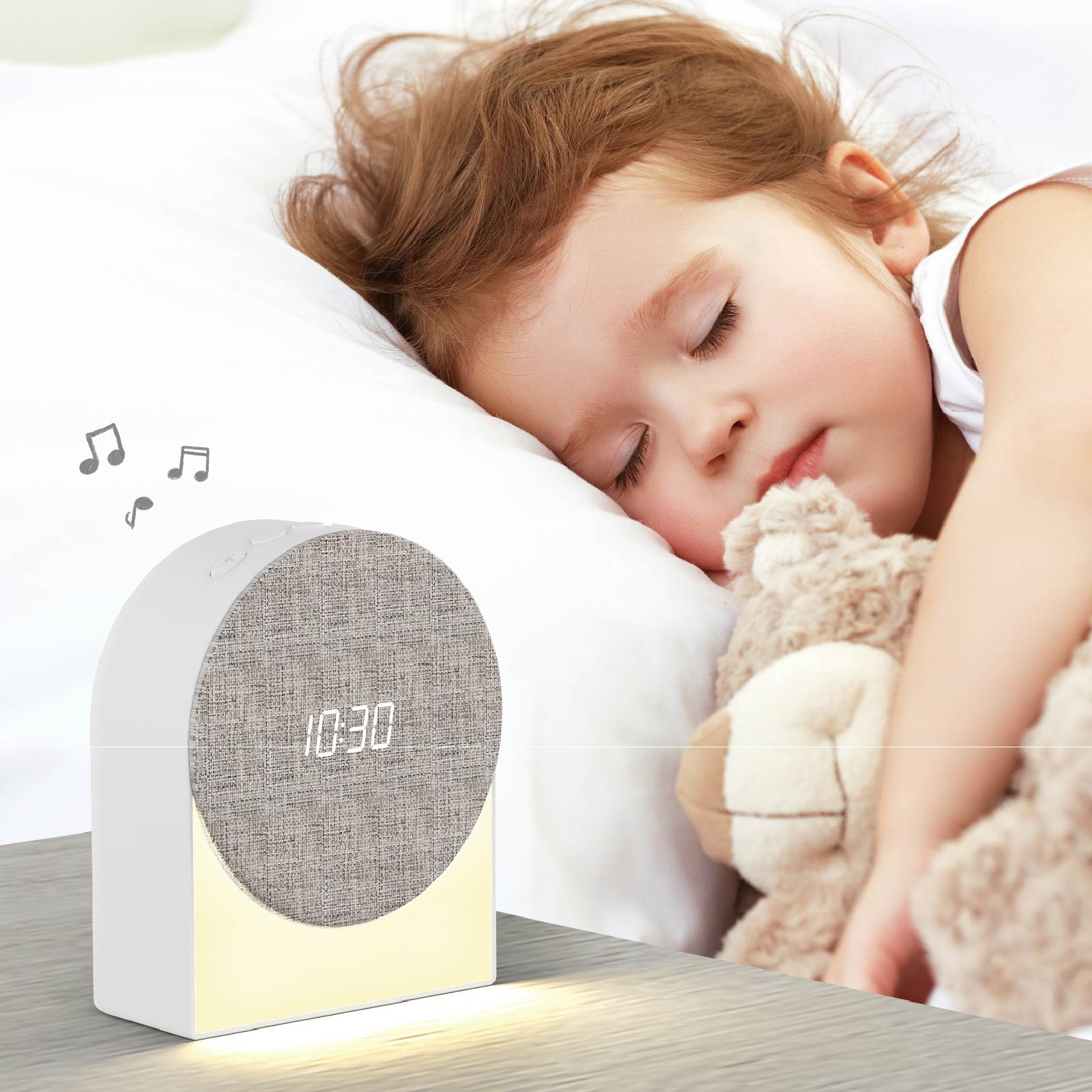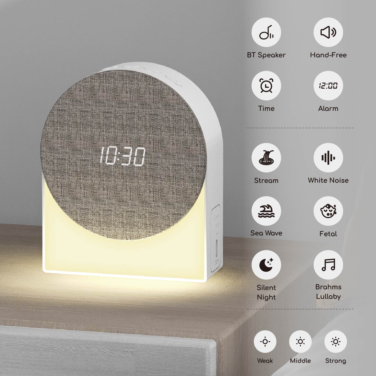 Function: Bluetooth Speaker, Handsfree, Alarm Clock, Night Light, Sleep Aid Noise( White Noise / Stream / Sea Wave / Fetal / Silent Nigh / Brahms Lullaby )