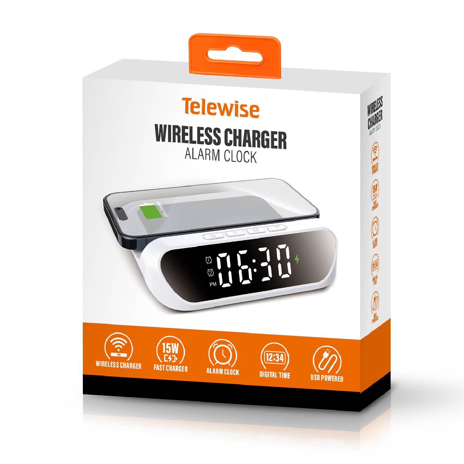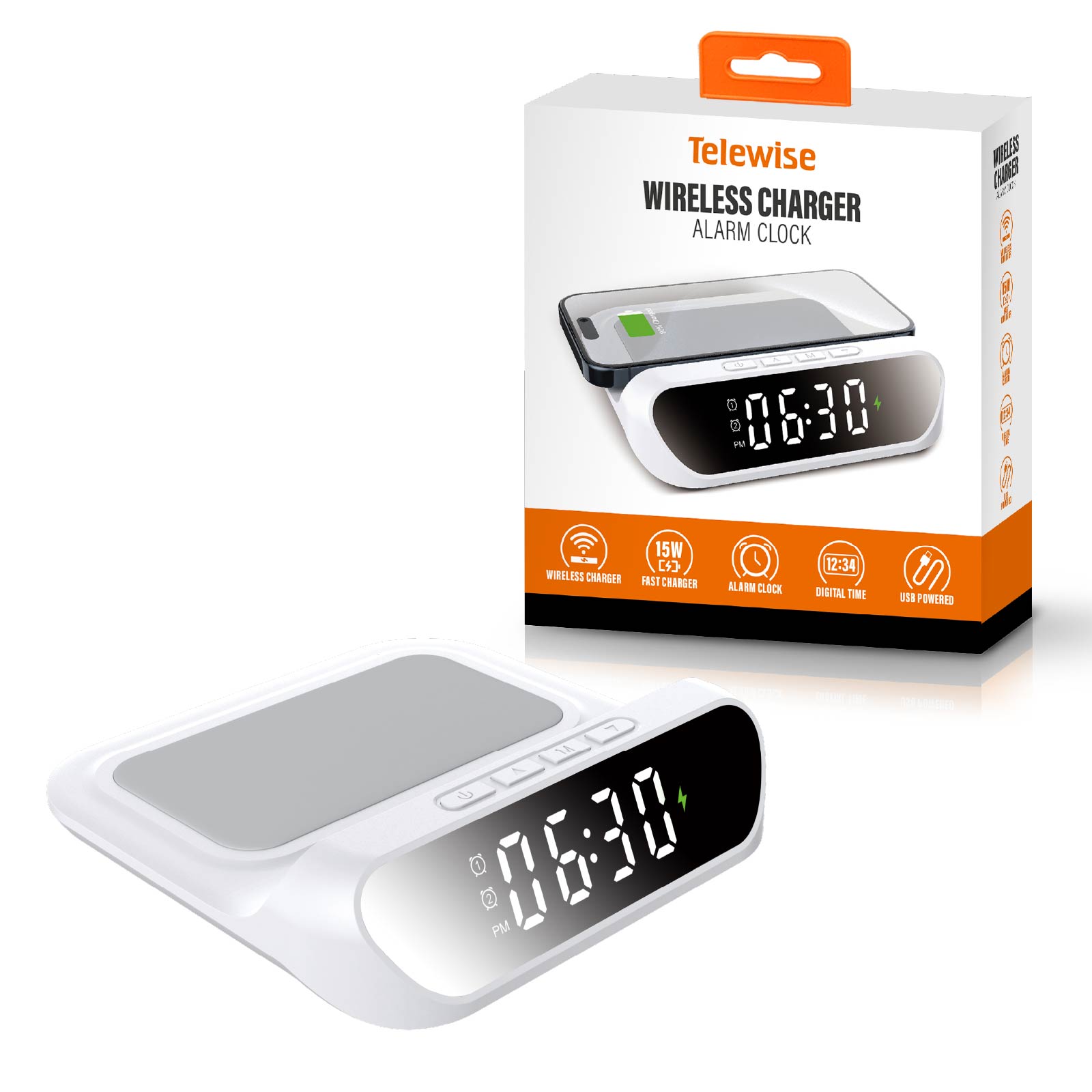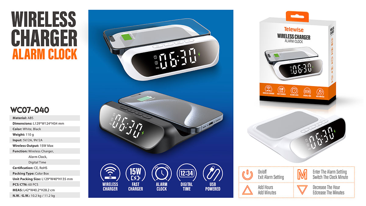 WC07-040Alarm Clock, Wireless Charger, are integrated into one design.