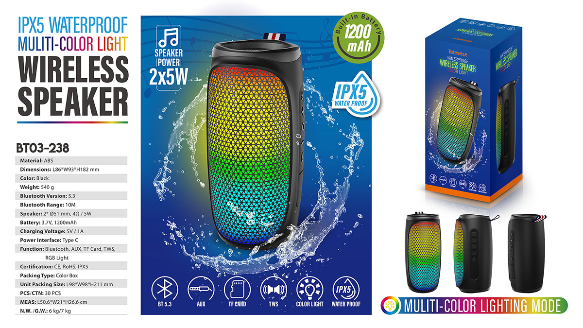 - Function : Bluetooth, AUX, TF Card, TWS, RGB Light, IPX5 Waterproof