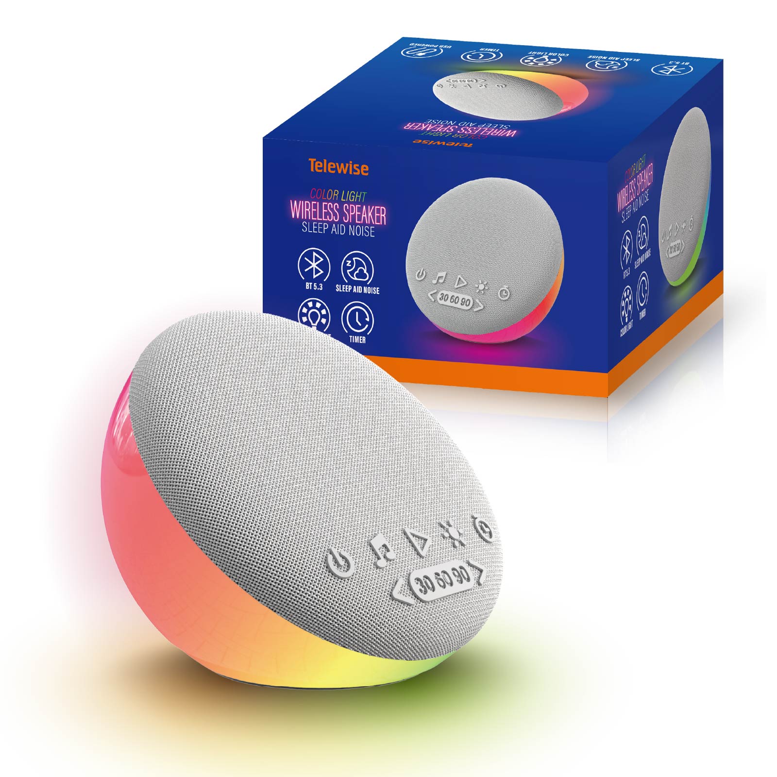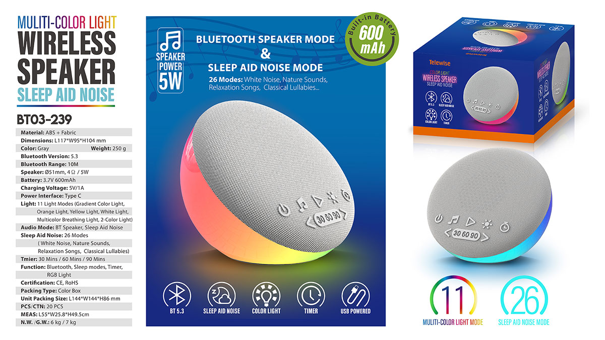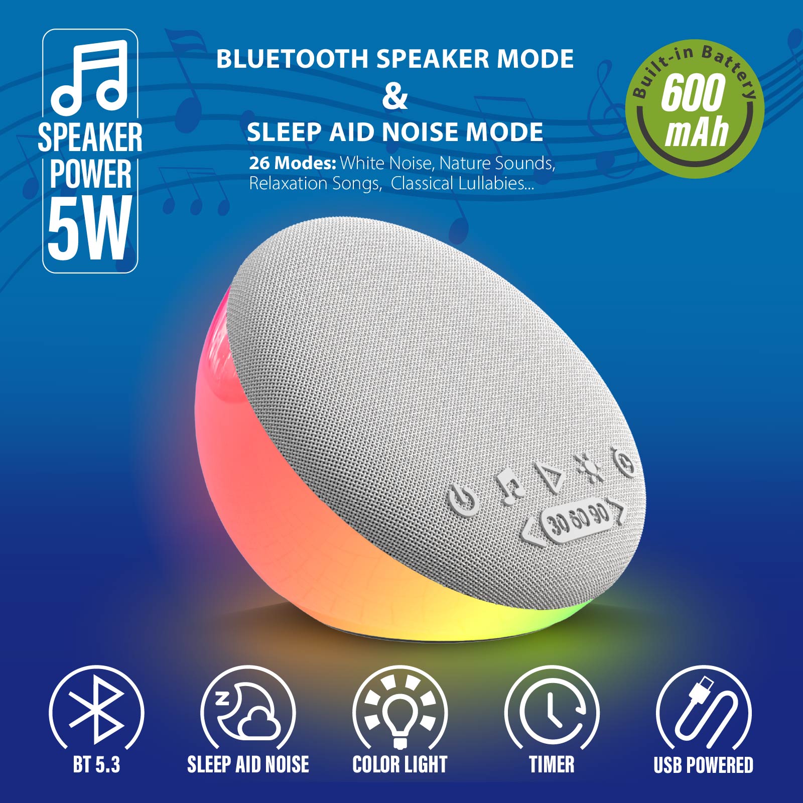 - Function : Bluetooth Speaker, Sleep Aid modes, Timer, RGB Light