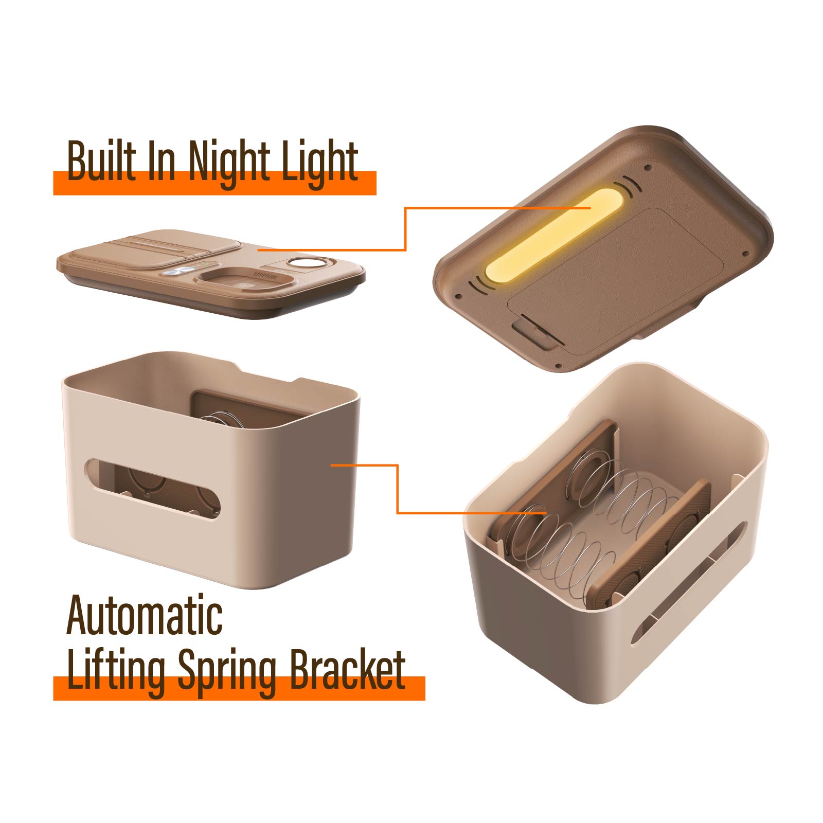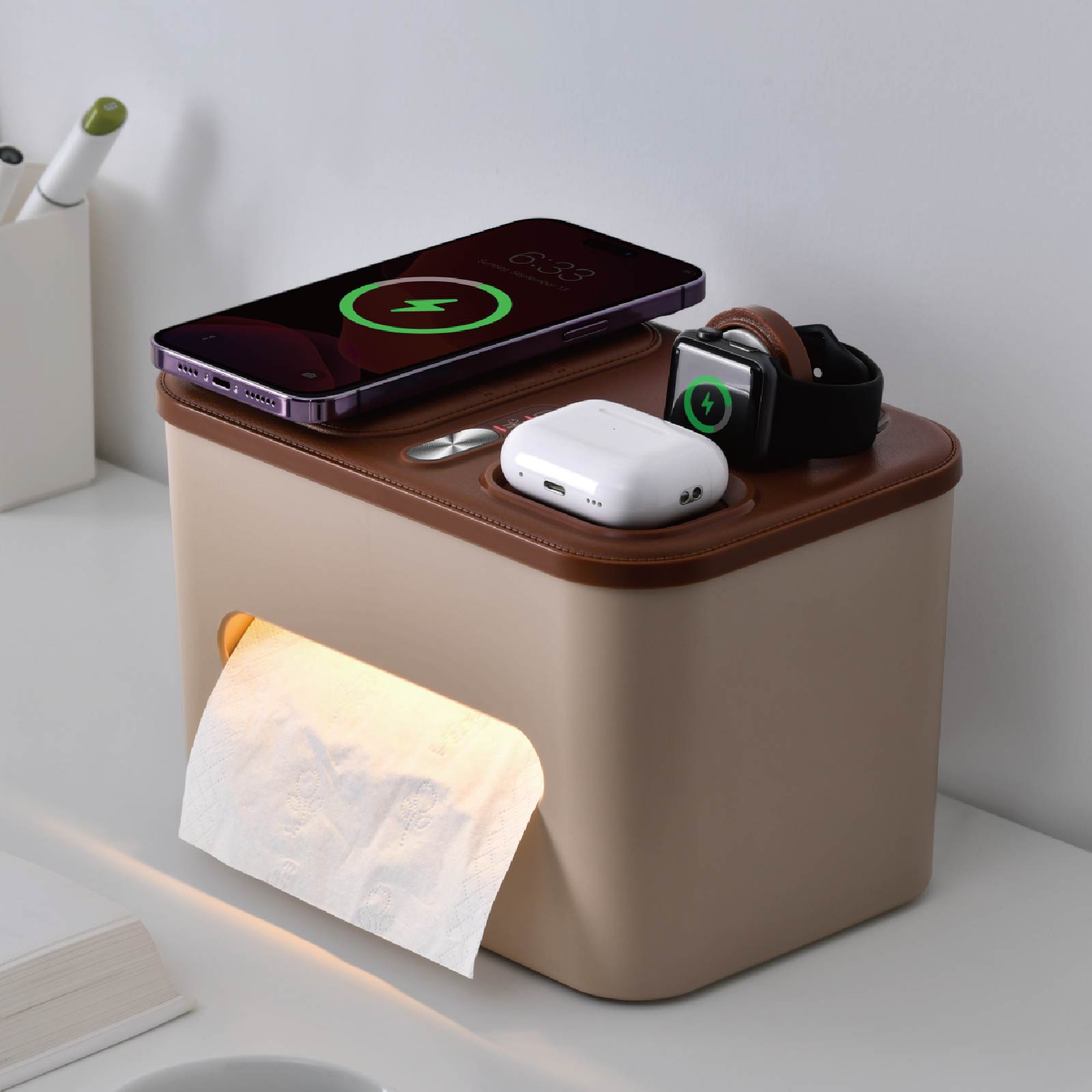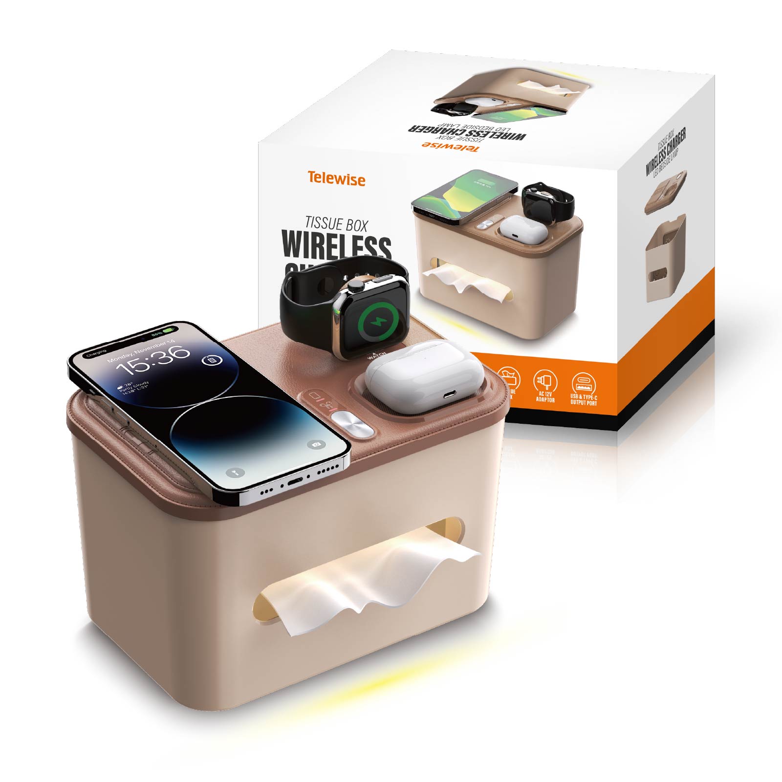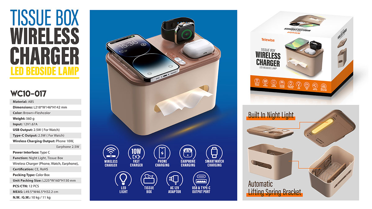 WC10-017Tissue Box, Wireless Charger & LED Bedside Lamp , are integrated into one design.
