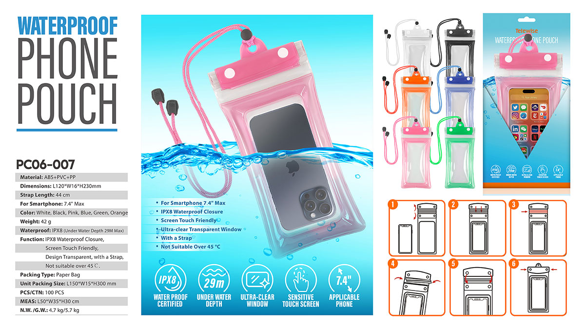 PC06-007Function: IPX8 Waterproof Closure, Screen Touch Friendly, Design Transparent, wIth a Strap, Not suitable over 45℃.