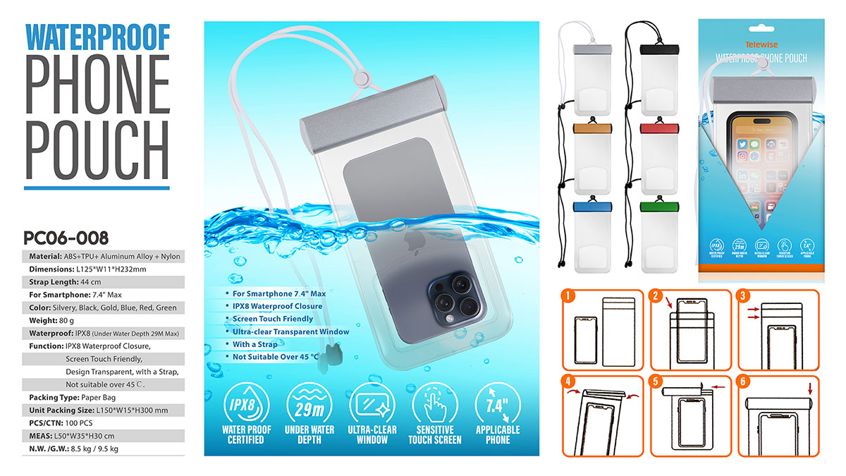 PC06-008Function: IPX8 Waterproof Closure, Screen Touch Friendly, Design Transparent, wIth a Strap, Not suitable over 45℃.