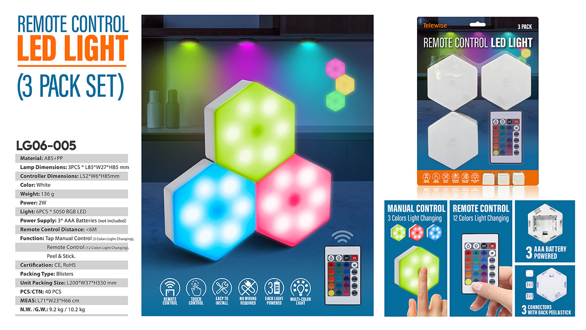 LG06-005Function: Tap Manual Control (3 Colors Light Changing), Remote Control(12 Colors Light Changing), Timer, Peel & Stick, Wireless Operation.