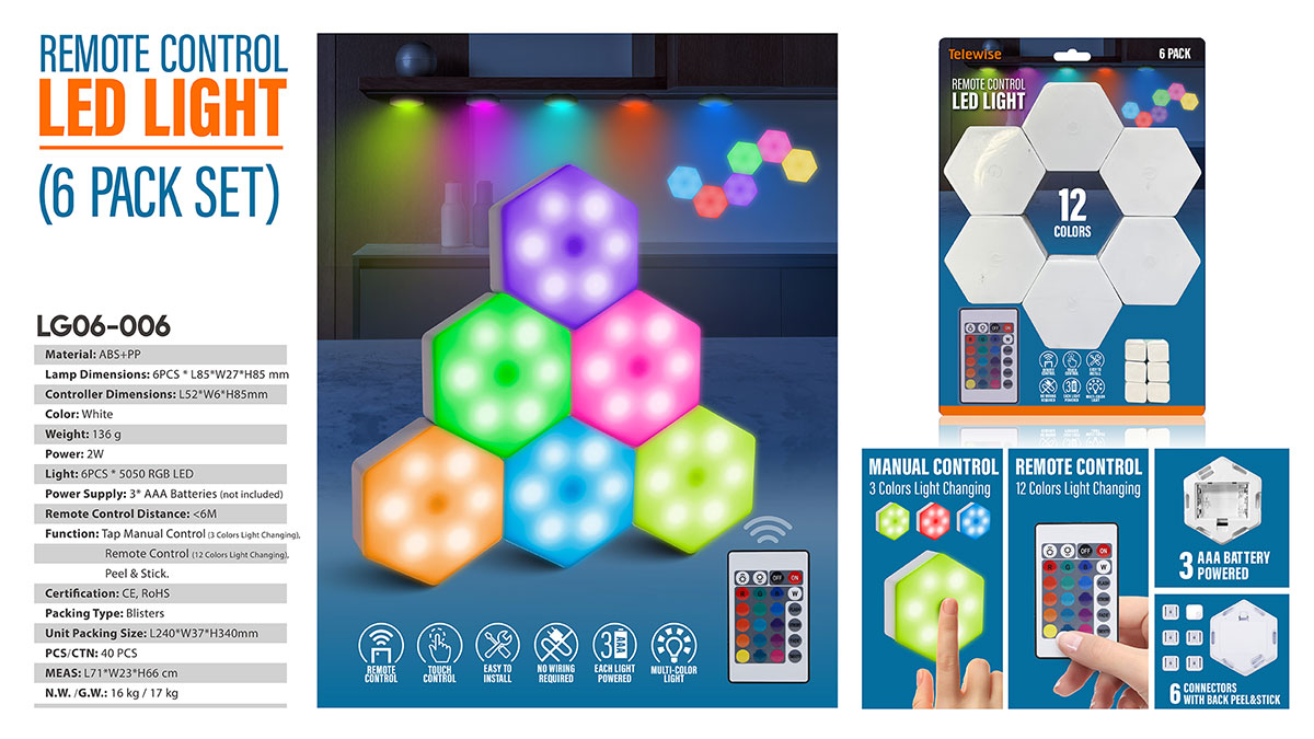LG06-006Function: Tap Manual Control (3 Colors Light Changing), Remote Control(12 Colors Light Changing), Timer, Peel & Stick, Wireless Operation.