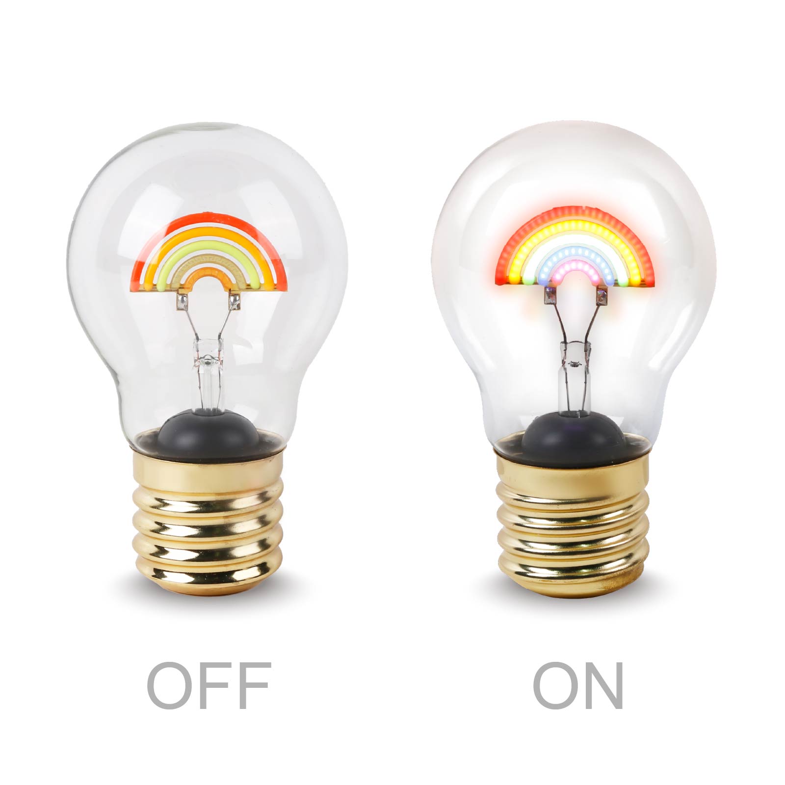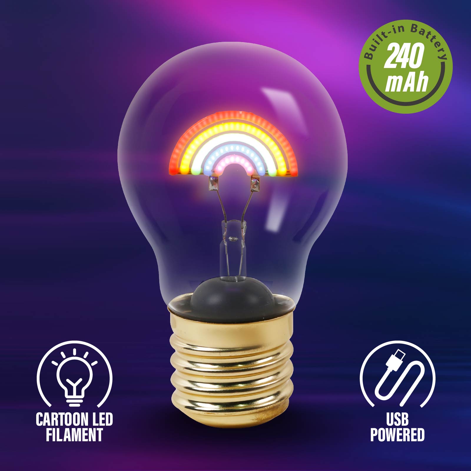 LG03-083This cordless, rechargeable table light is styled like a regular light bulb, but turning it on reveals a colorful rainbow inside! Rather than screwing into a socket, this wonderfully whimsical accent light stands on its own to provide ambient illumination as a bedside nightlight, tabletop light, or anywhere else that needs a little colorful personality.