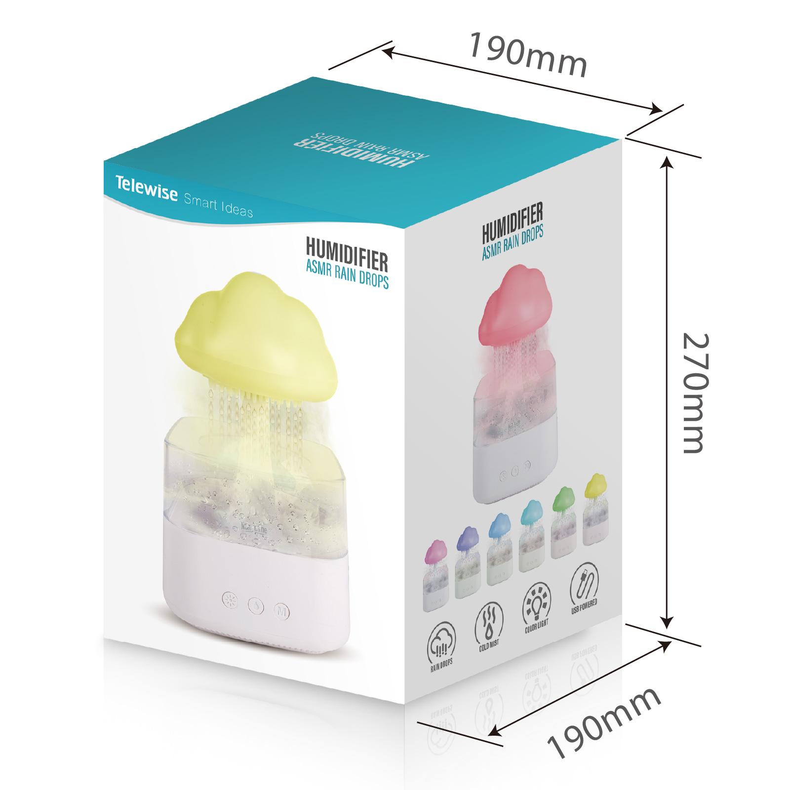 - Function : Cold Mist, Water Drip Effect, Simulate Rain Sound, Color Night Light, USB Powered.