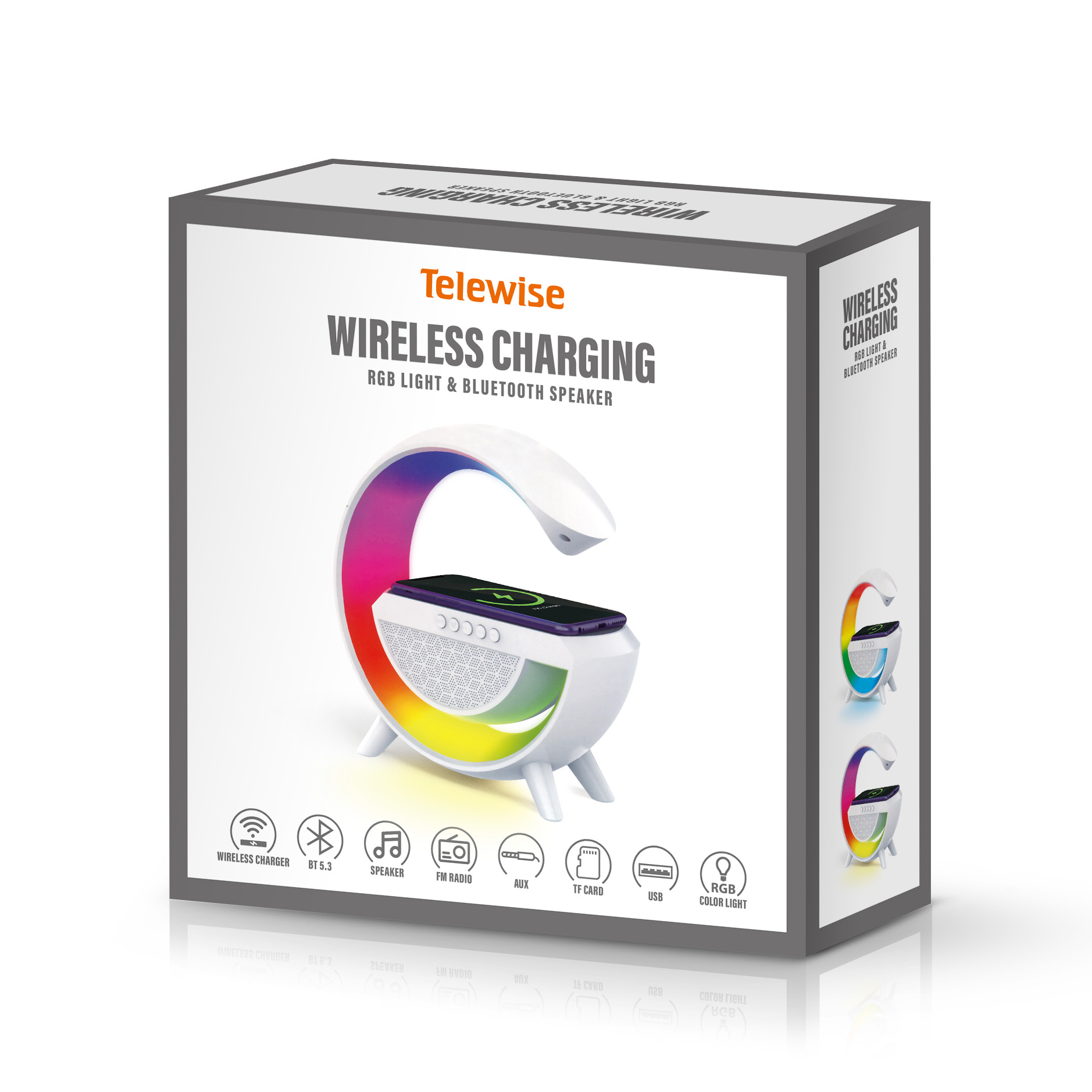 - Function : Bluetooth, AUX, USB, TF Card, FM Radio, Wireless Charger, RGB Light