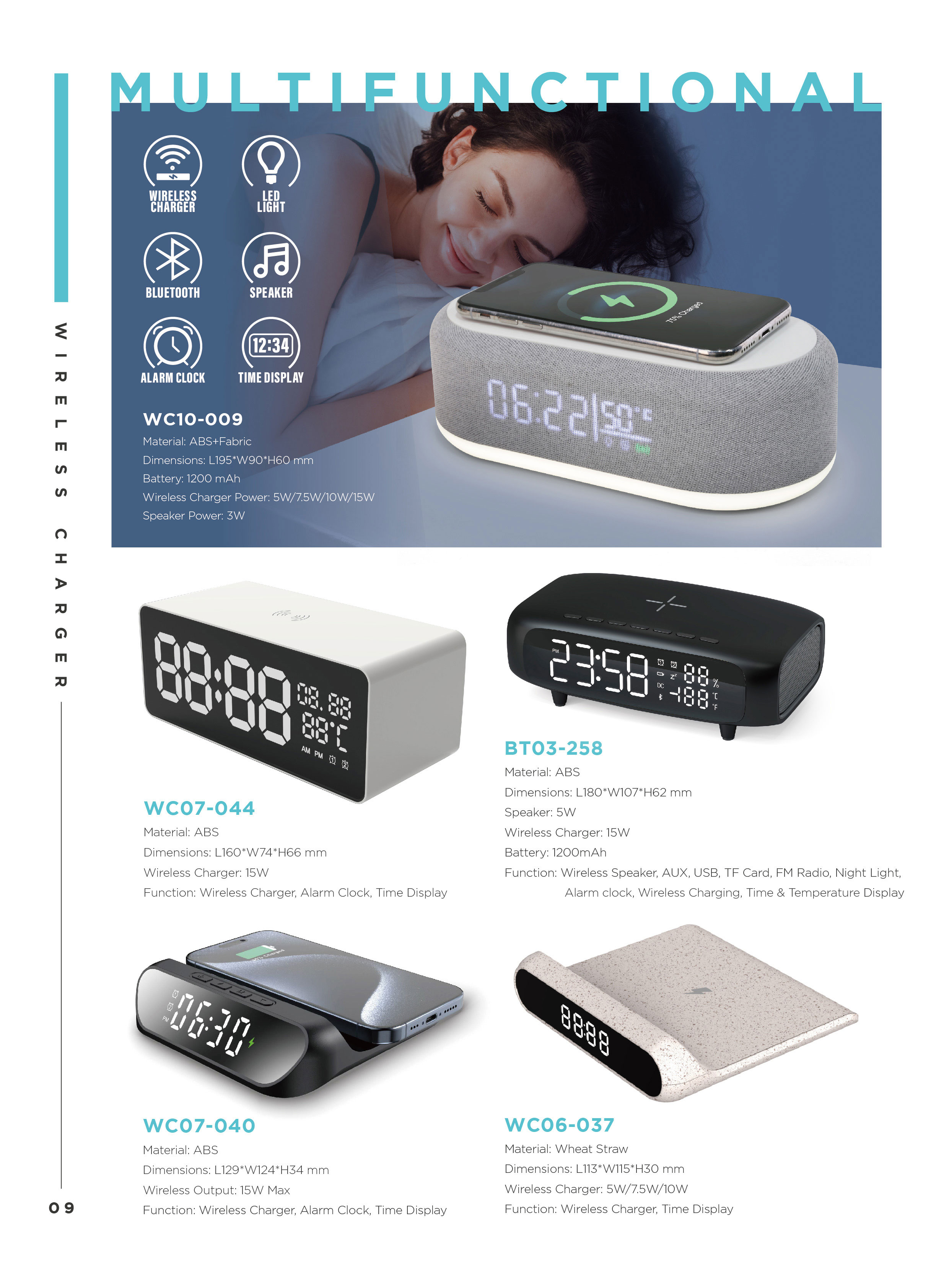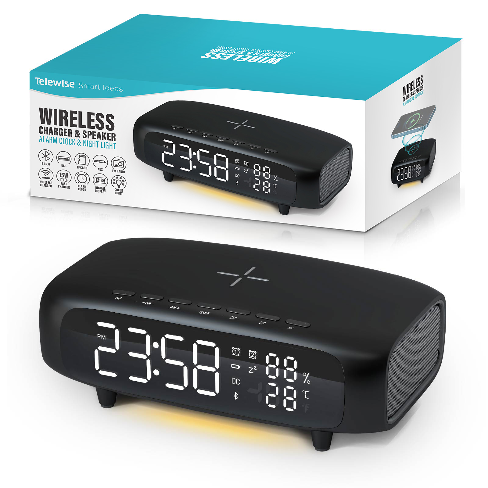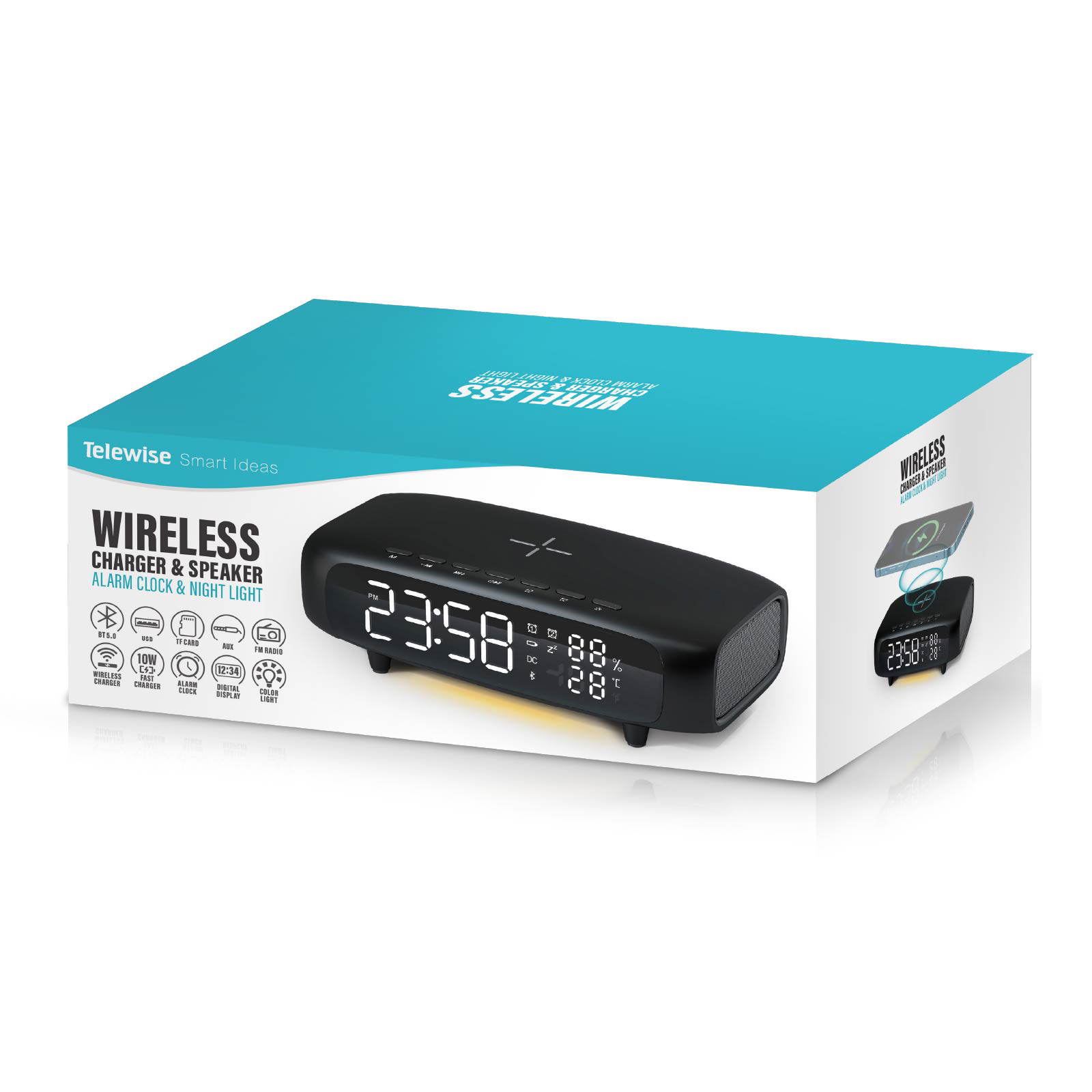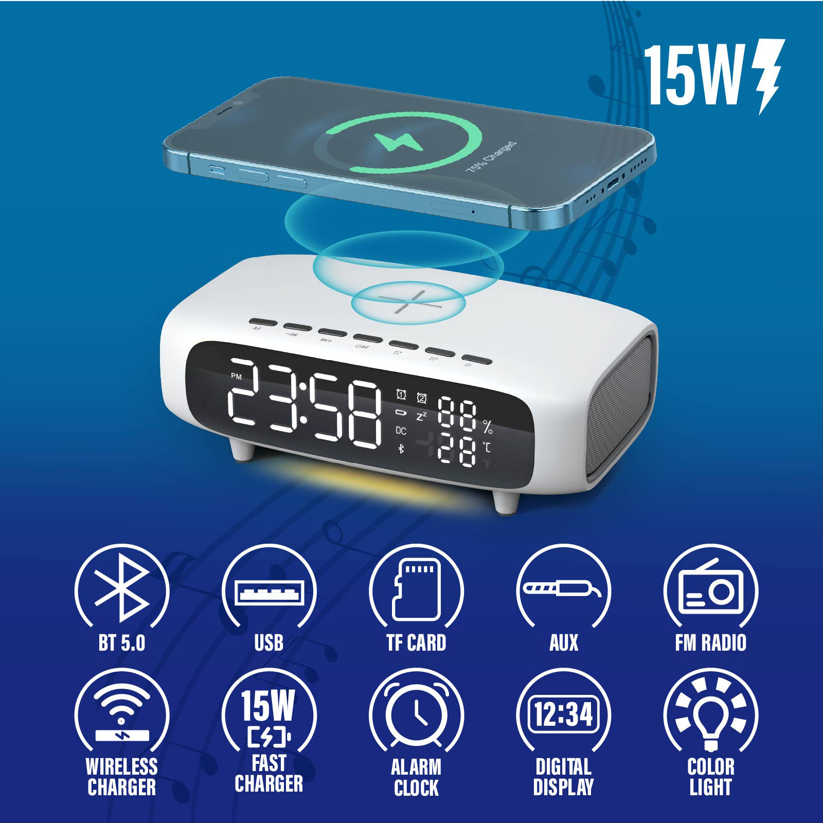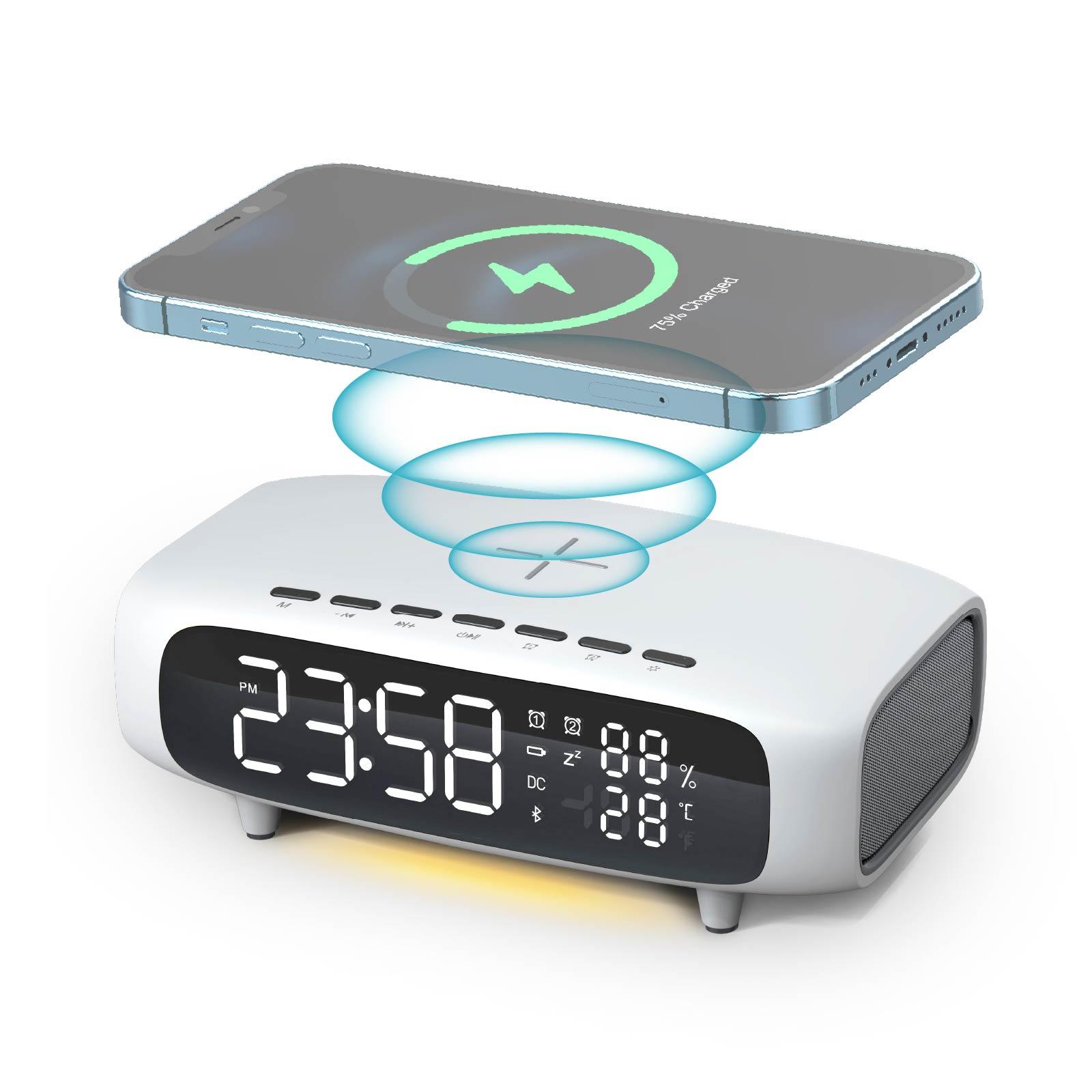 - Function : Bluetooth, AUX, USB Disk, TF Card, FM, Night Light, Alarm clock, Wireless charging, temperature display