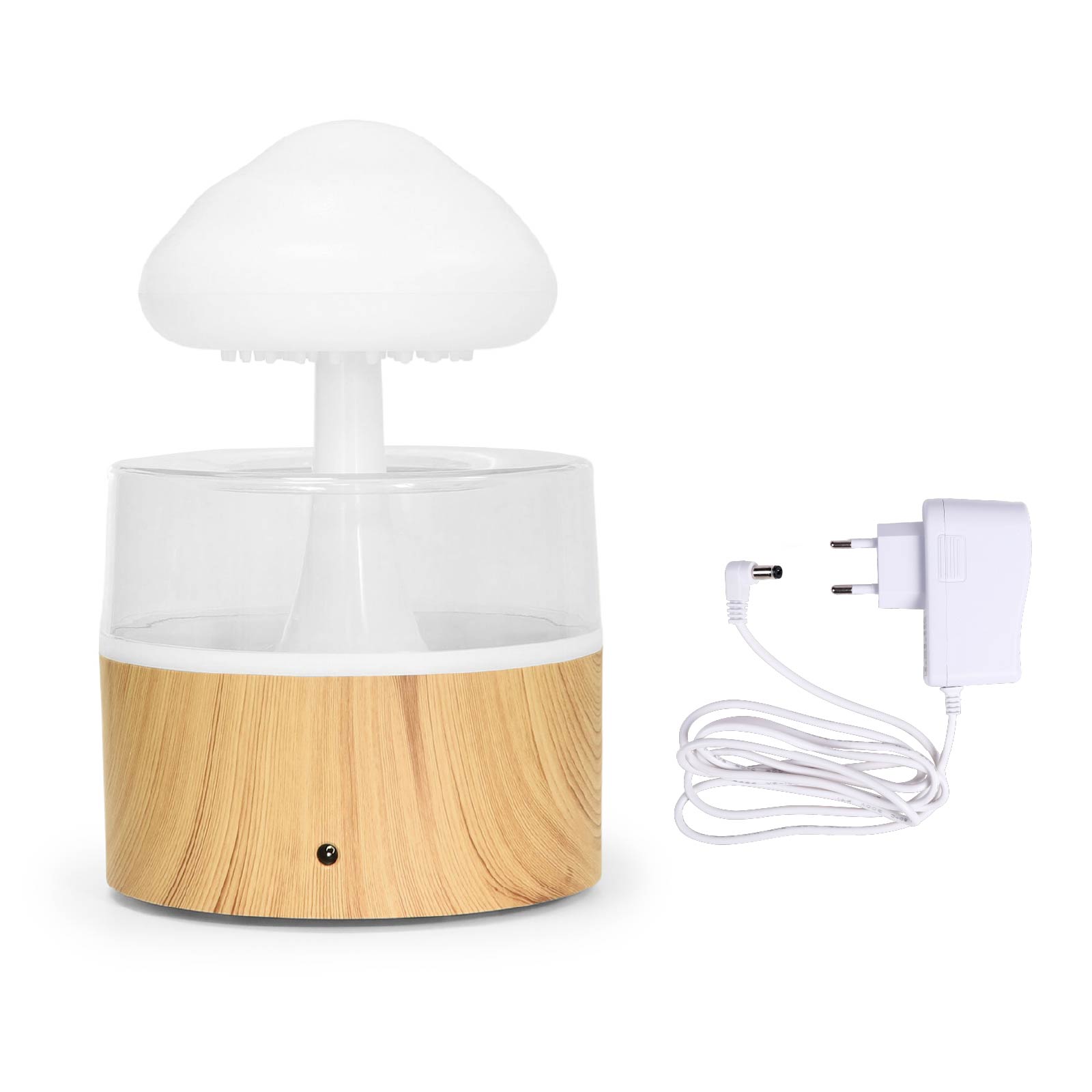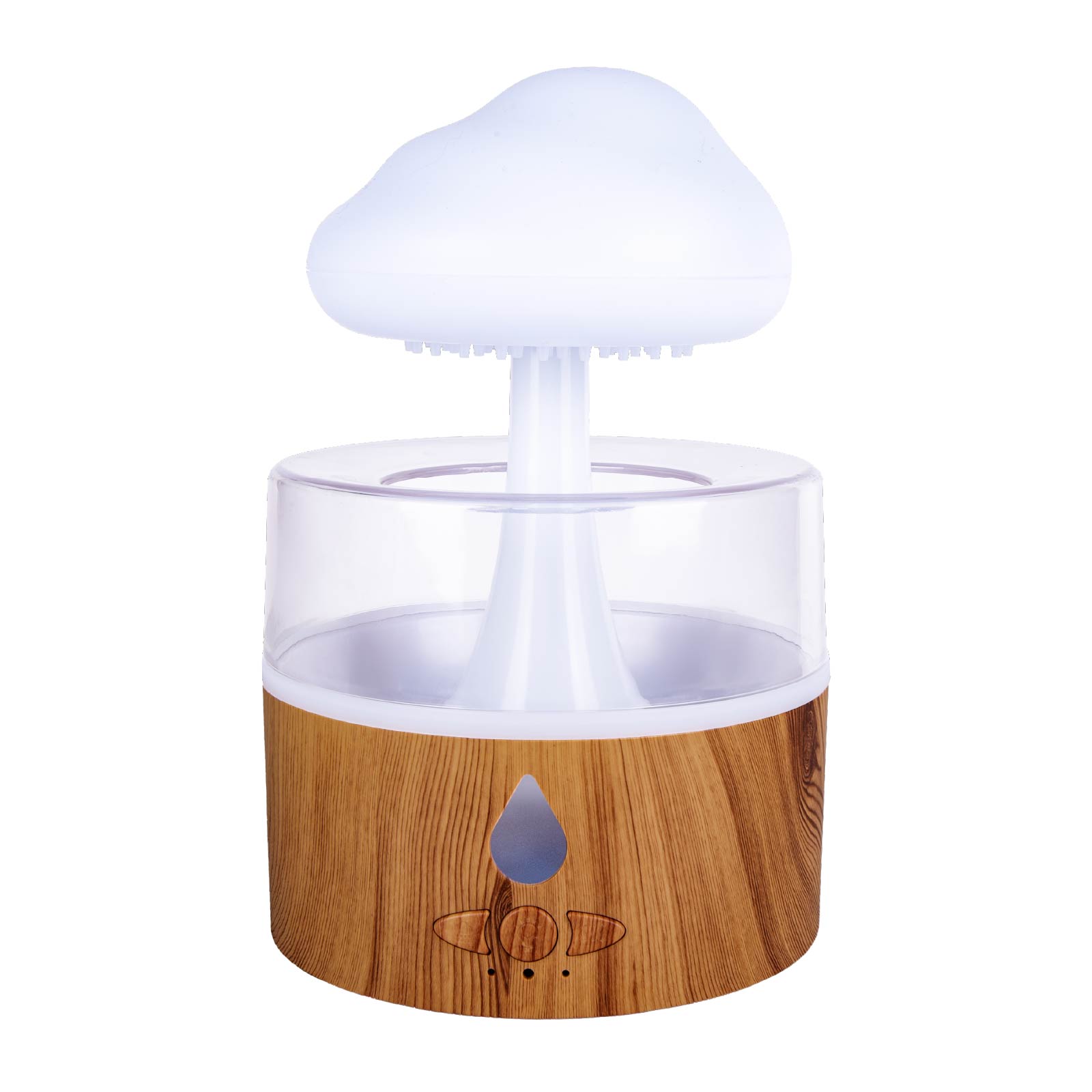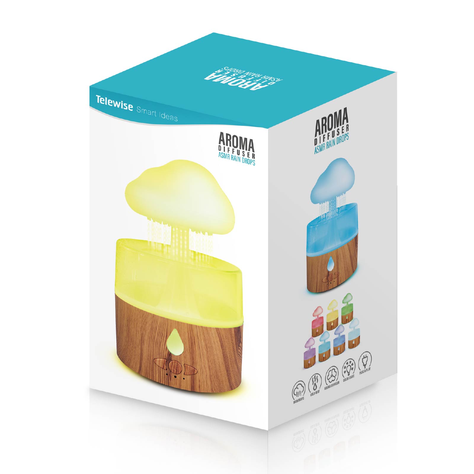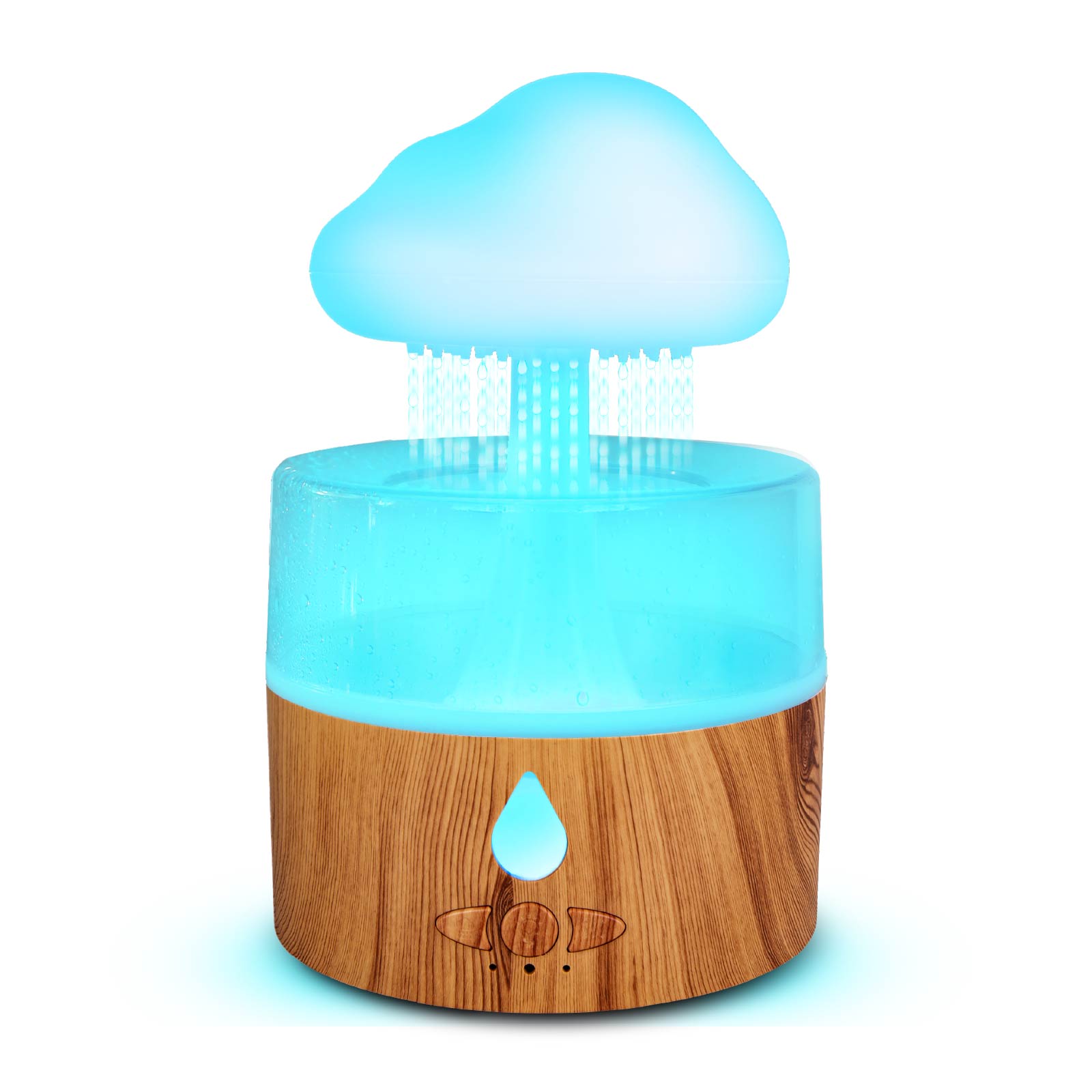 - Function : Aroma Diffuser, Cold Mist, Water Drip Effect, Simulate Rain Sound, Color Night Light.